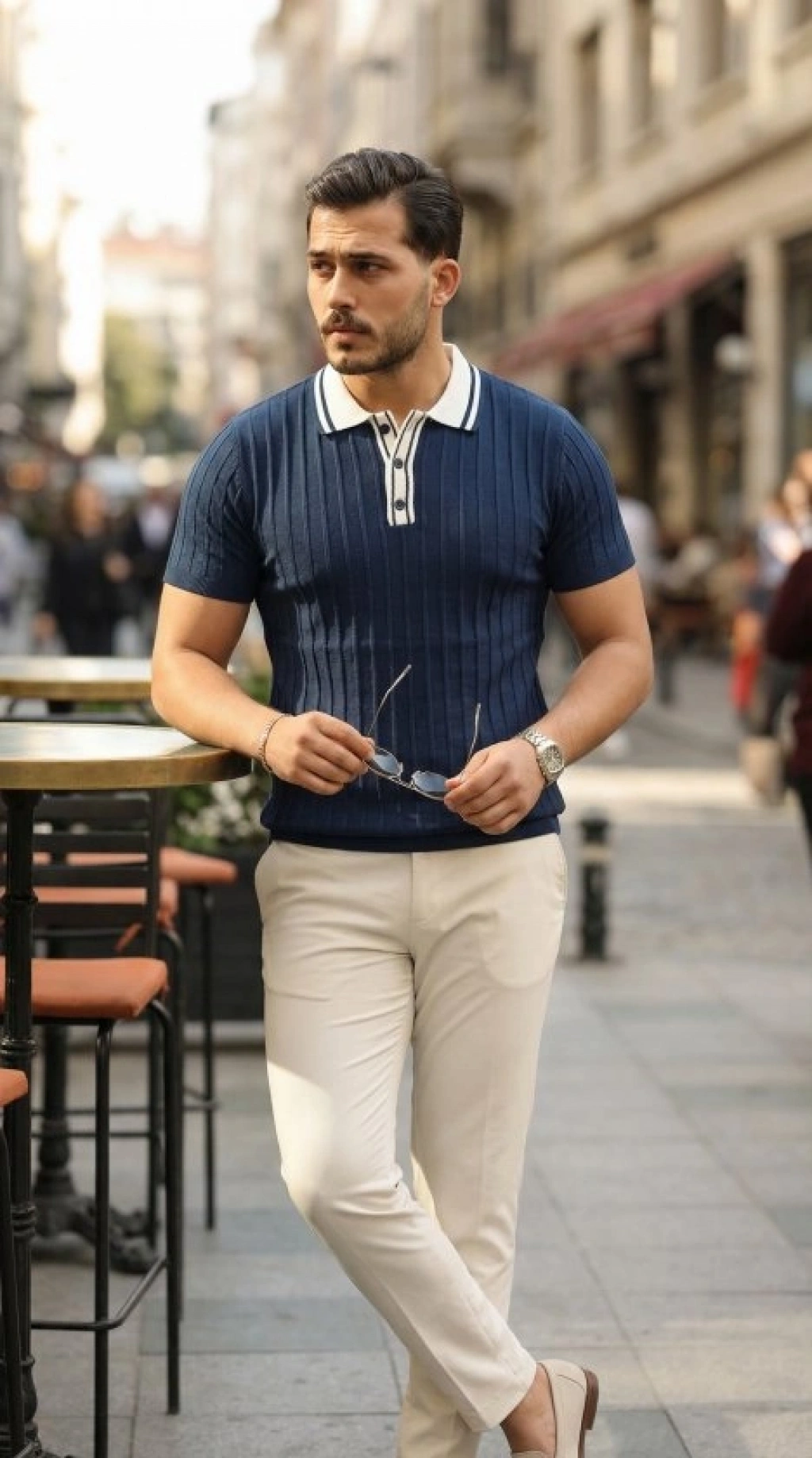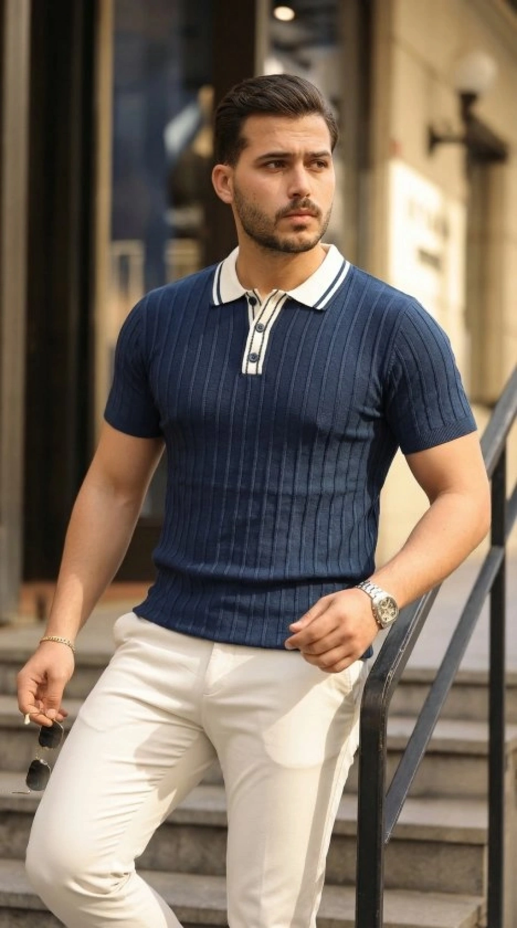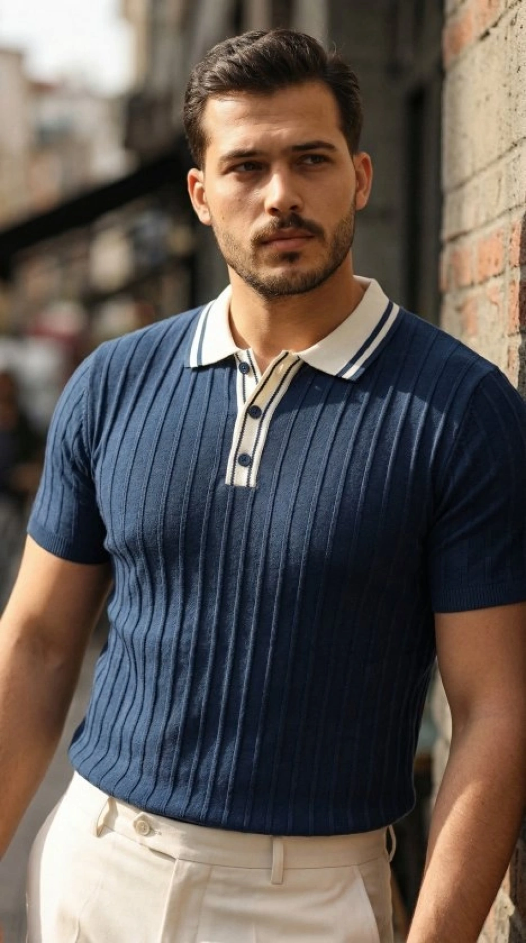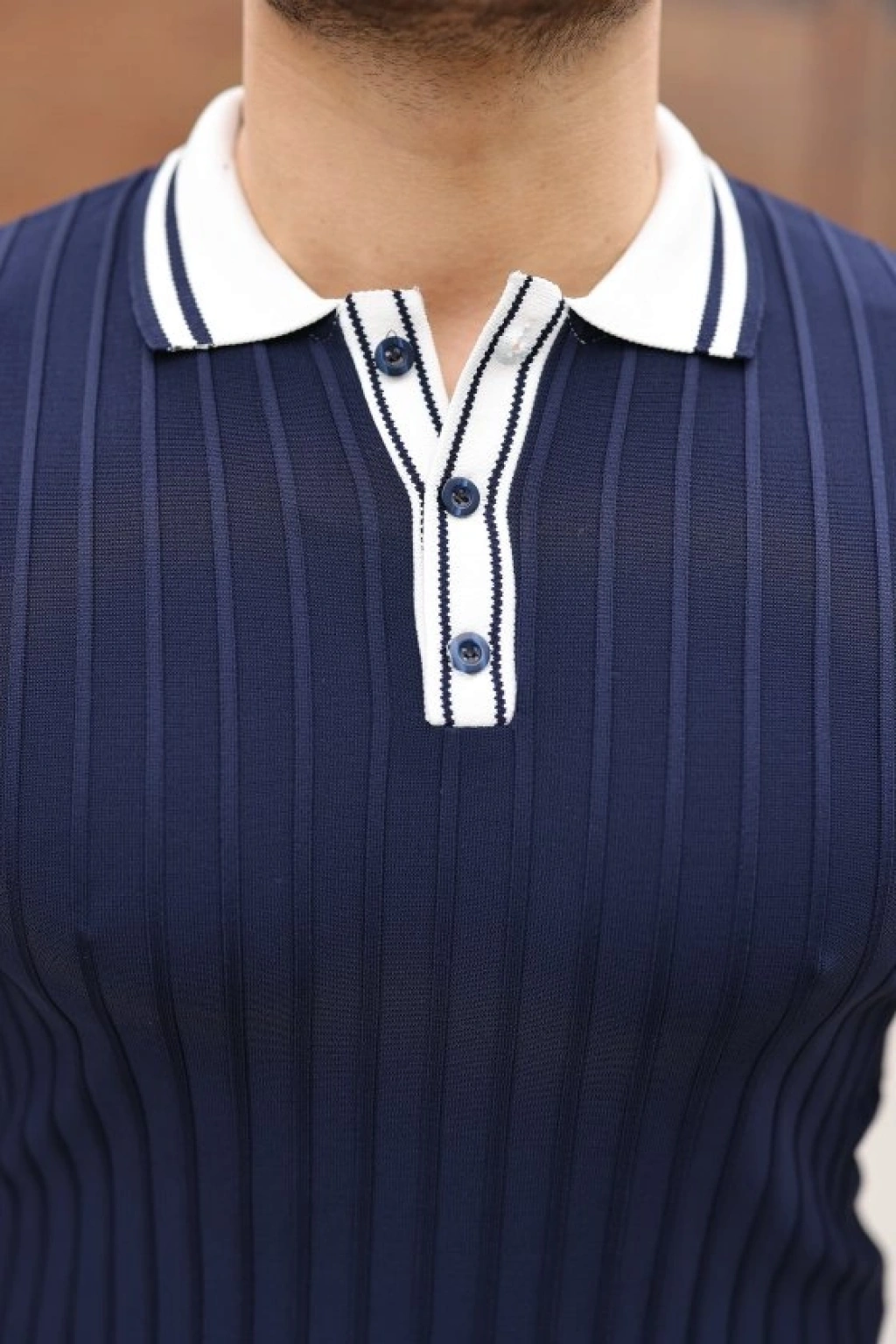 Erkek Düğme Yakalı Kontrast Yaka Triko Tişört