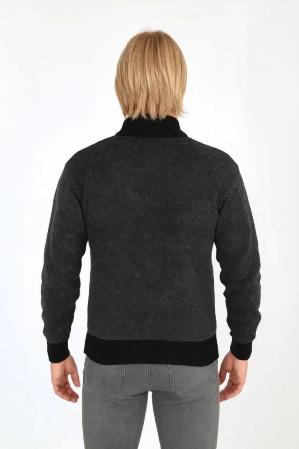Erkek Fermuarlı Triko Hırka Yüksek Yaka, Cepli, Günlük Şık Rahat Kalıp Triko - Siyah