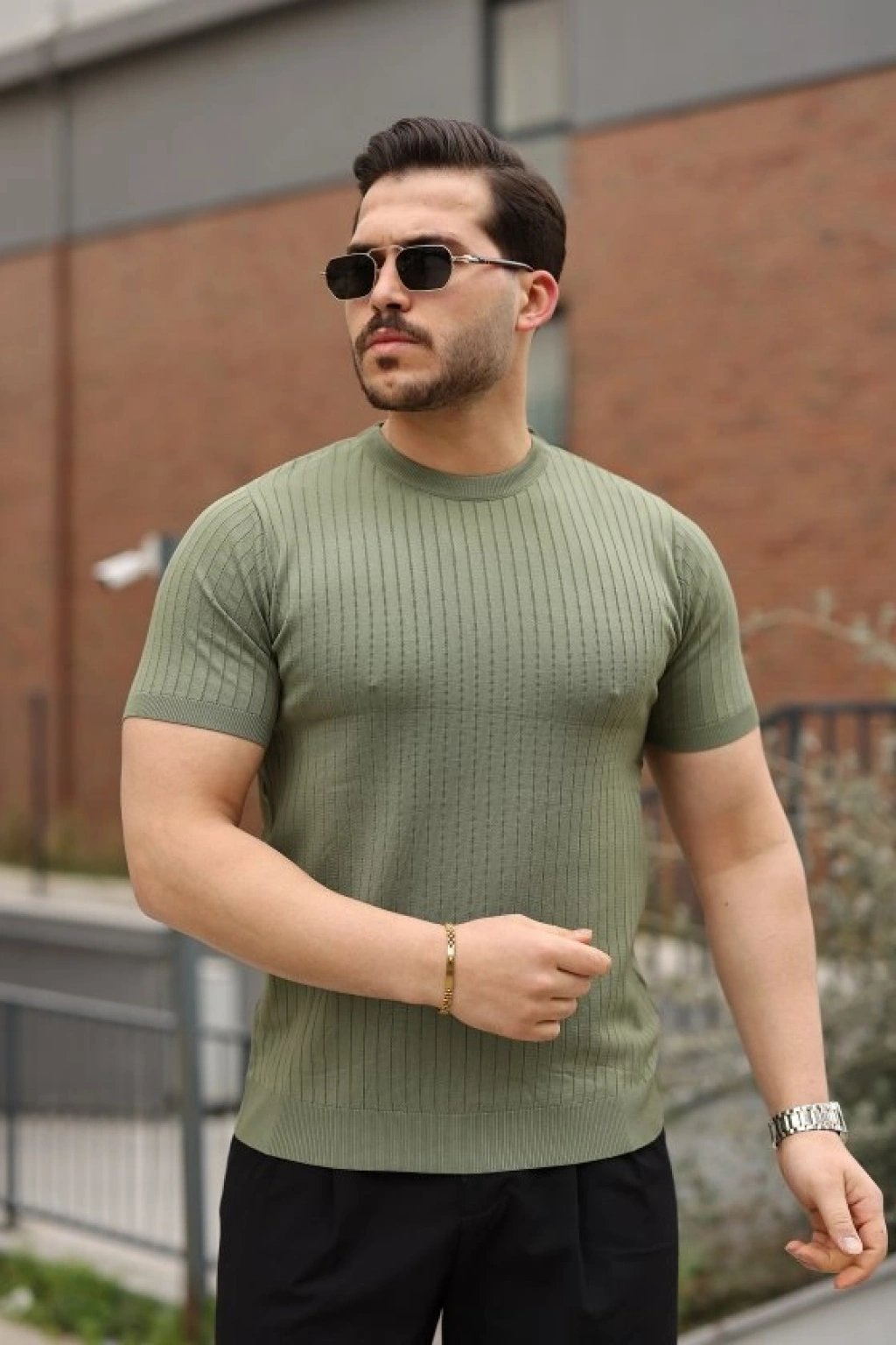 Erkek Yazlık Fitilli Triko Tişört Kısa Kol Bisiklet Yaka Thirt Haki