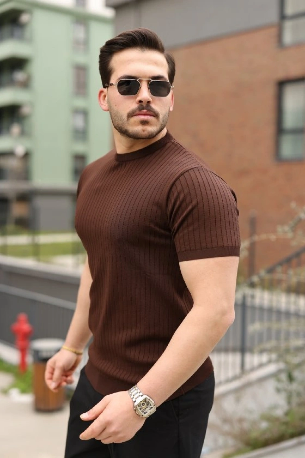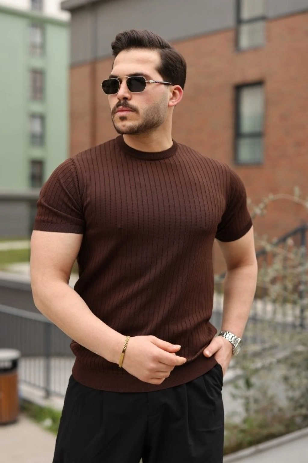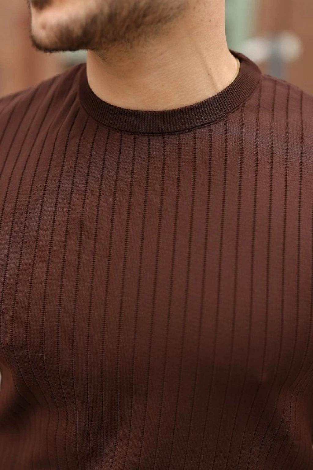 Erkek Yazlık Fitilli Triko Tişört Kısa Kol Bisiklet Yaka Thirt Kahverengi