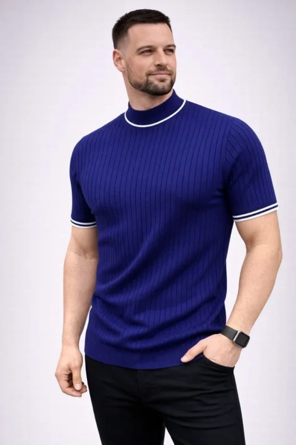 Erkek Fitilli Triko Dokuma Kısa Kol Tişört Yarım Boğaz odern Yazlık Thirt acivert