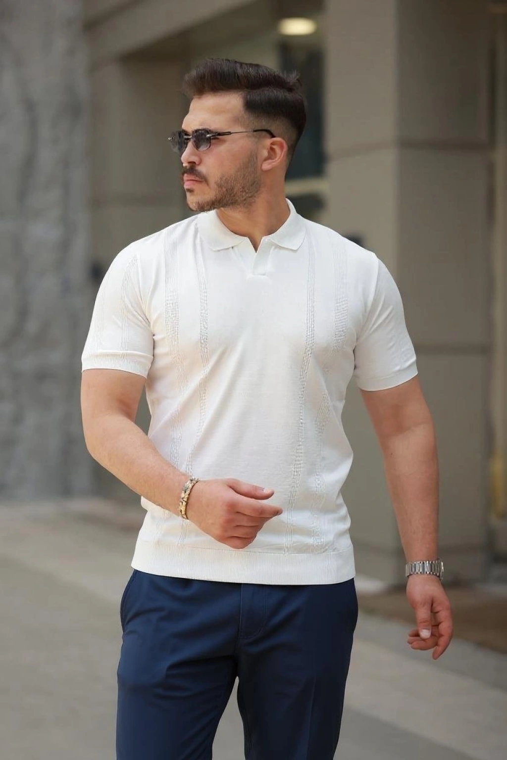 Erkek Fermuarlı Yaka Fitilli Triko Kısa Kollu Regular Fit Tişört Tshirt Beyaz