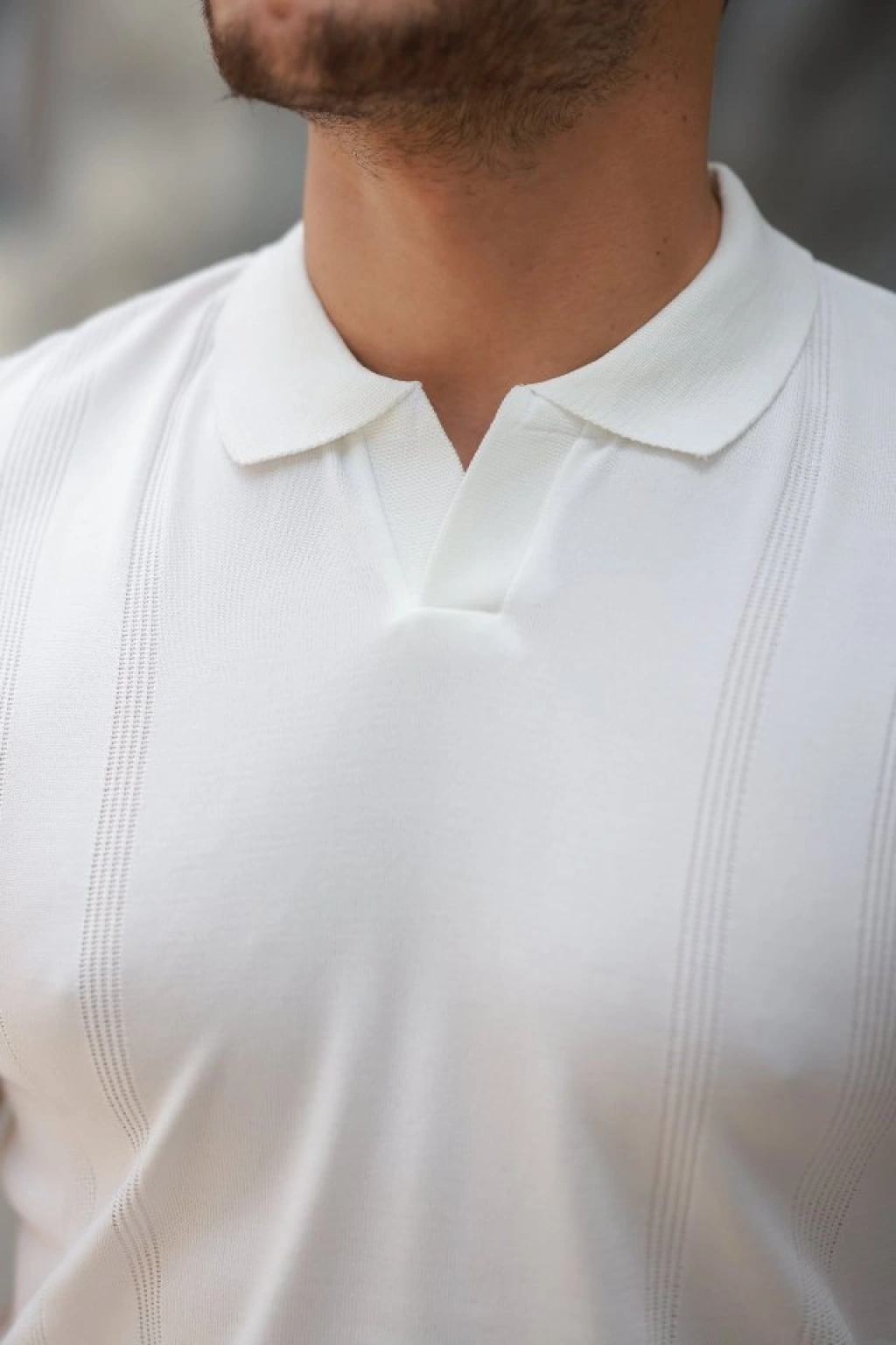 Erkek Triko Kumaş Yakalı Düğmesiz Açık Yaka Fitilli Kısa Kollu Regular Fit Tişört Tshirt Beyaz