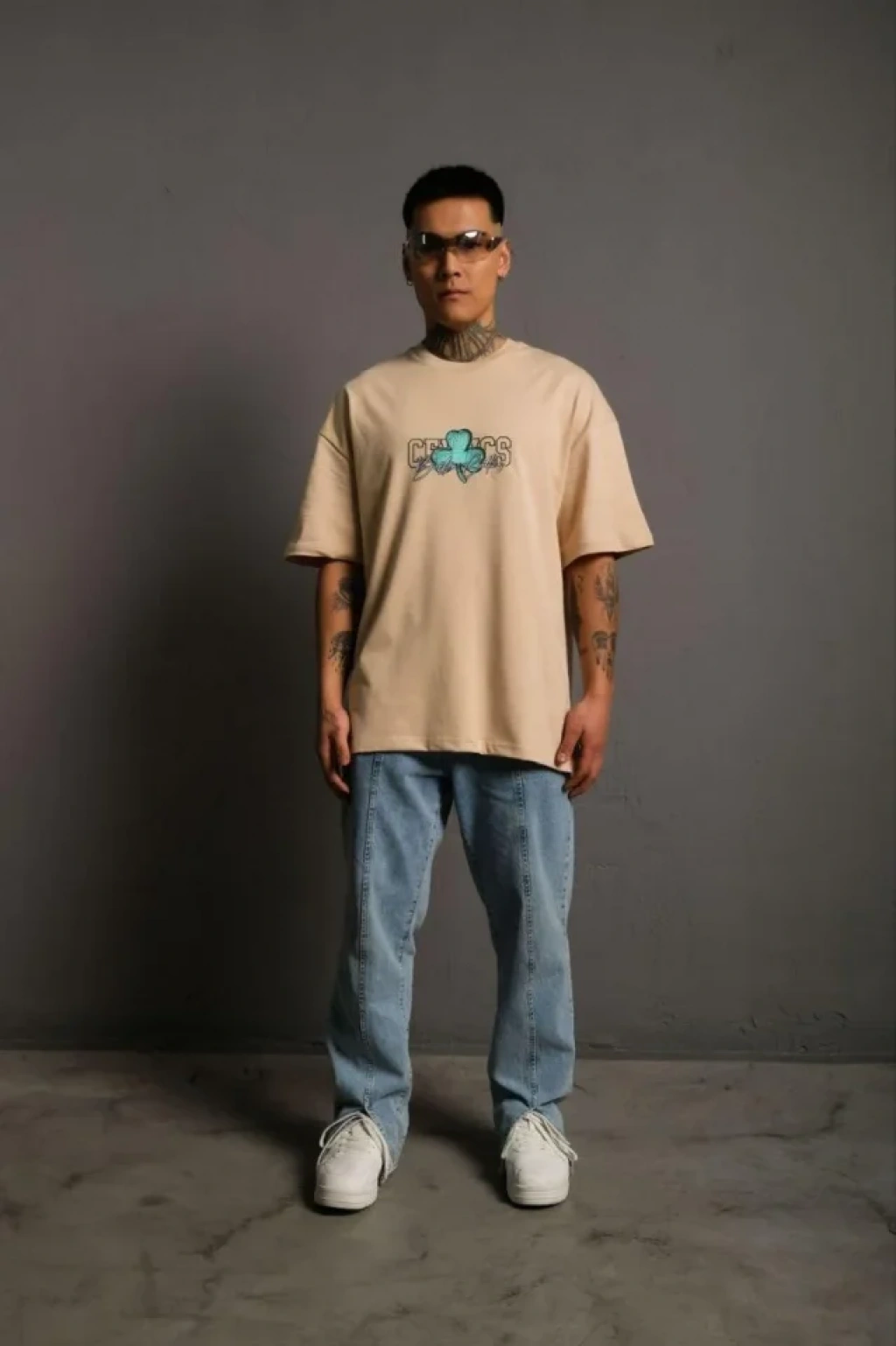 Erkek ırt Baskılı A Kalite Oversize Tshirt Bej
