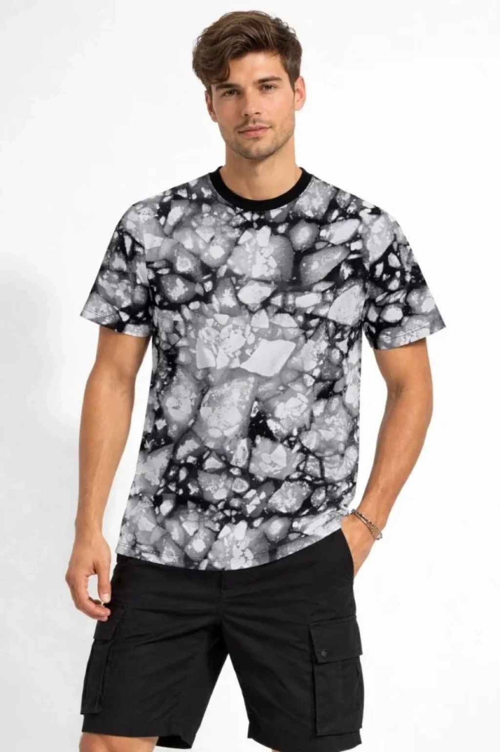 Erkek Siyah Gri Taş Desenli Tişört – Regular Fit, Bisiklet Yaka, Dijital Baskılı Modern Tasarım T-Shirt - Siyah