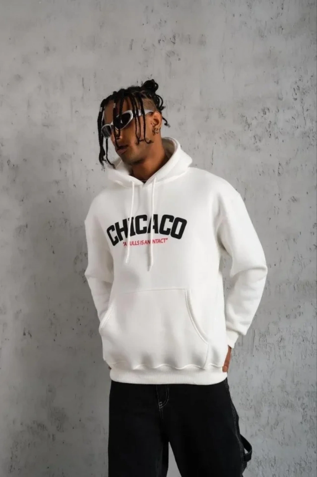 Erkek Kanguru Cepli Baskılı Kapüşonlu weatshirt Beyaz