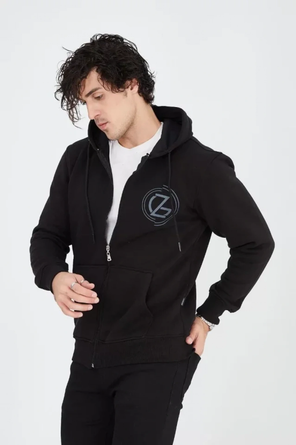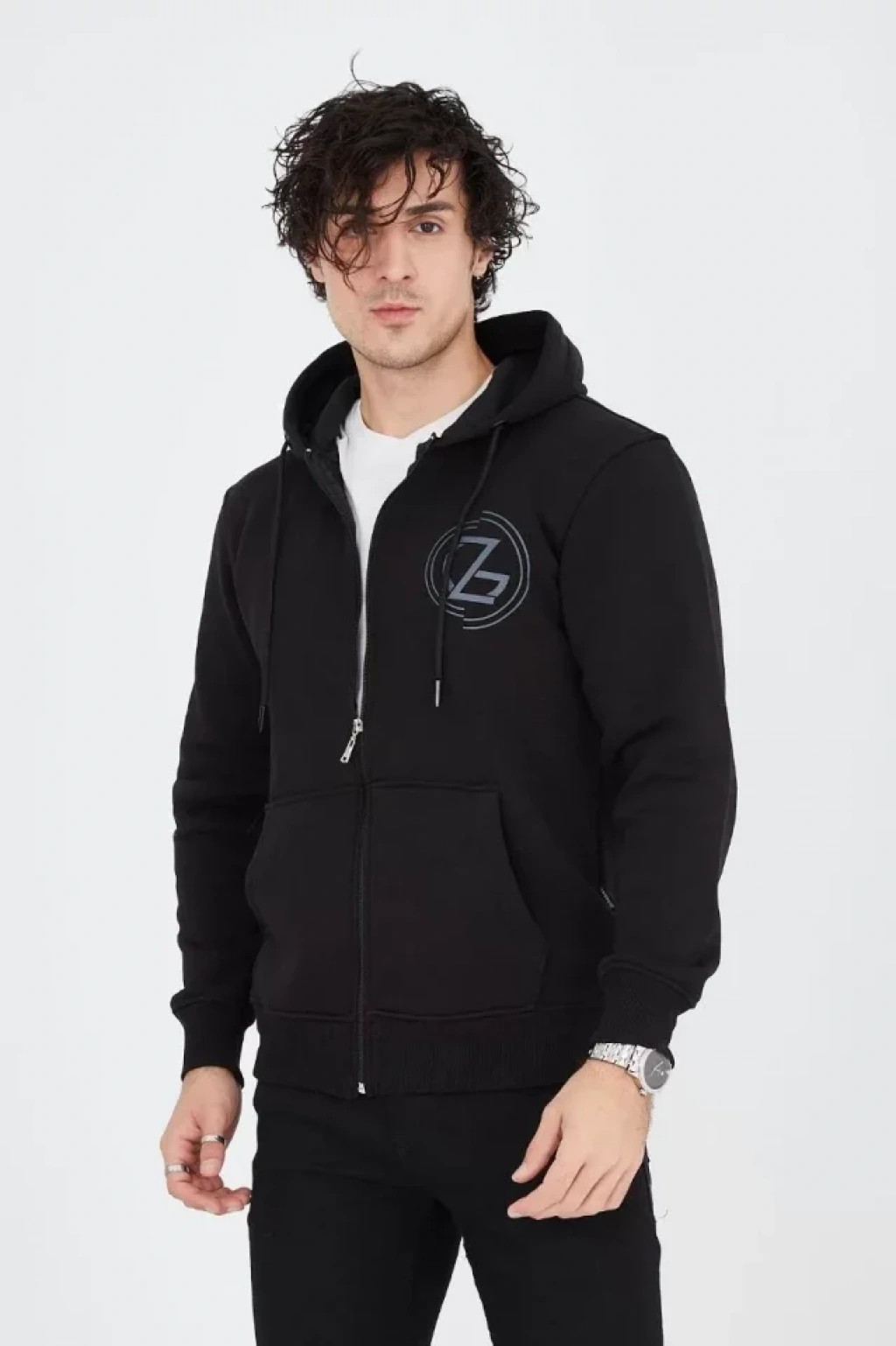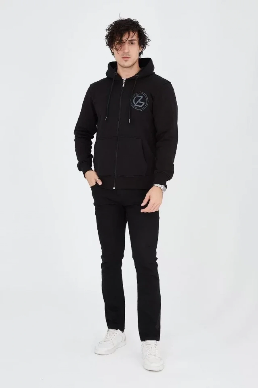 Üç İplik Baskılı Fermuarlı Kapşonlu Hırka Siyah