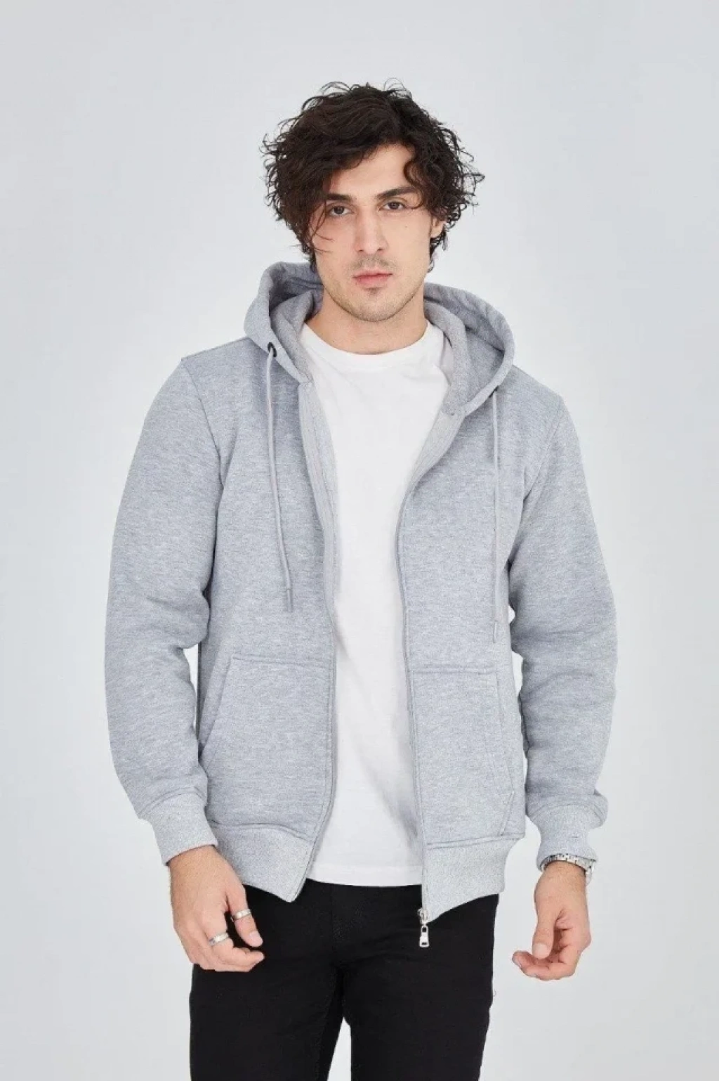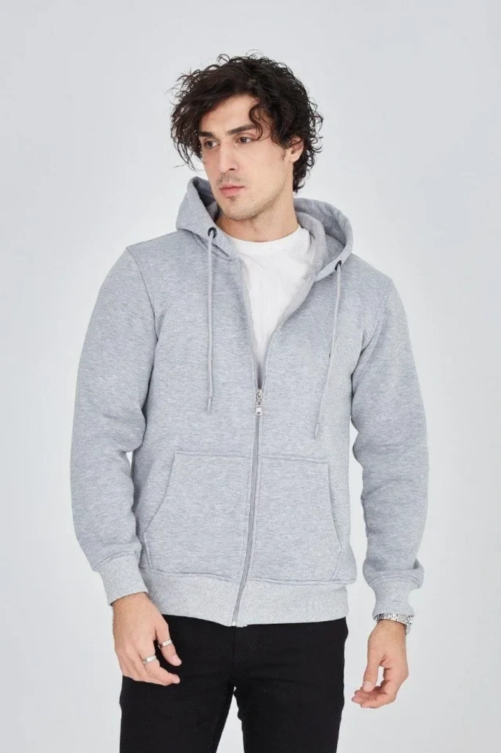 Erkek Kapüşonlu Düz Fermuarlı Hırka Gri