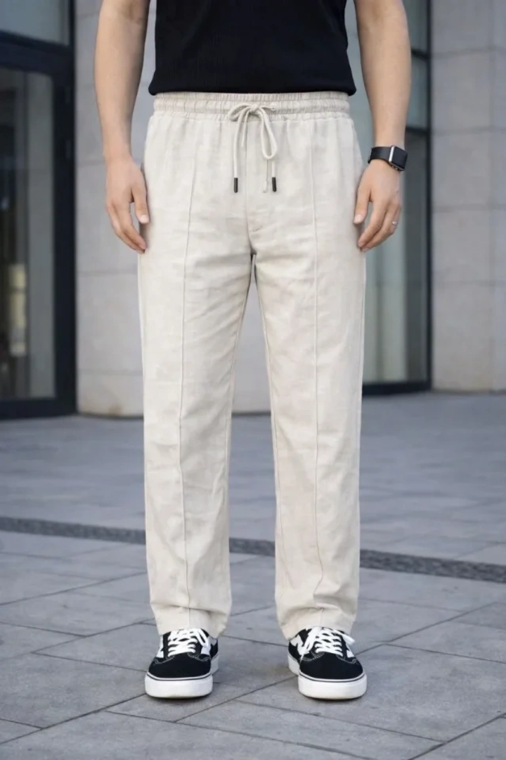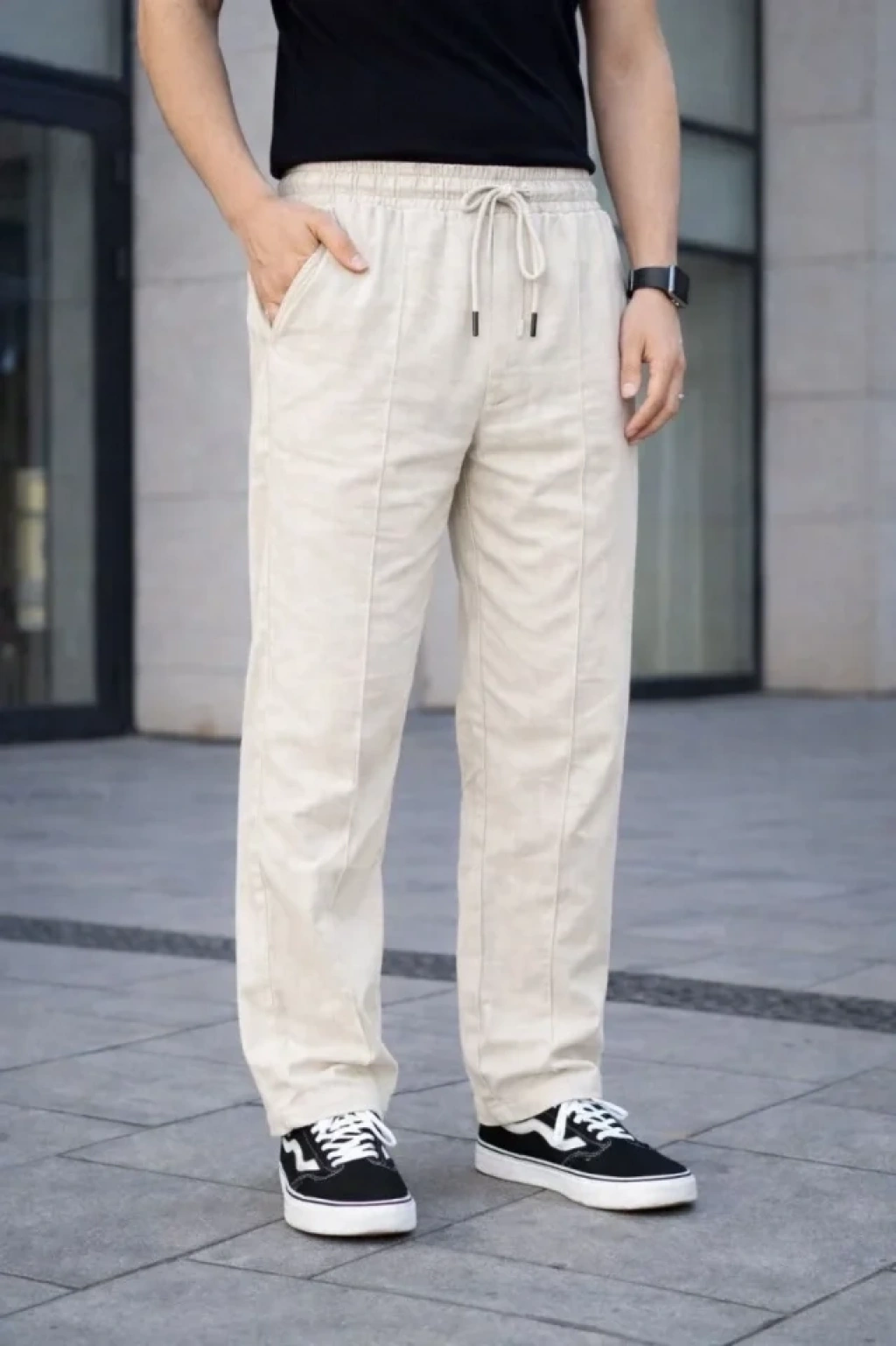 Erkek Keten Cepli Çıma Dikişli Jogger Buggy Pantalon Rahat Kalıp Krem