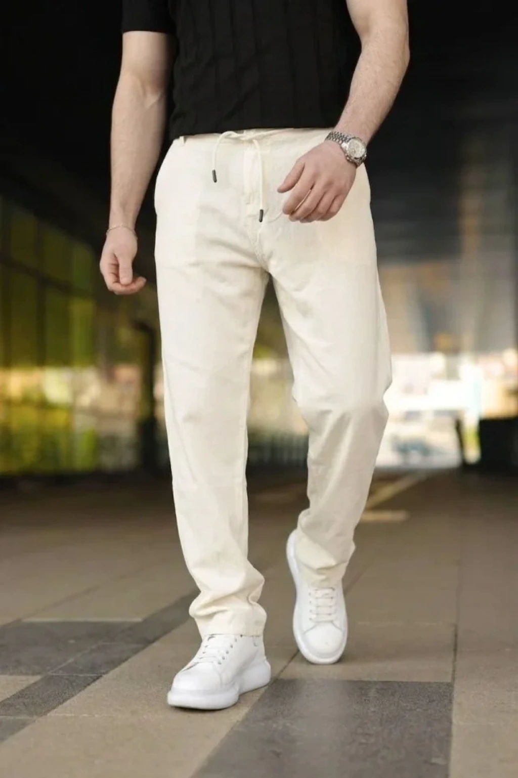 Erkek Keten Cepli Pantolon Lastikli Bel Bağcıklı Önden Fermuarlı - Krem