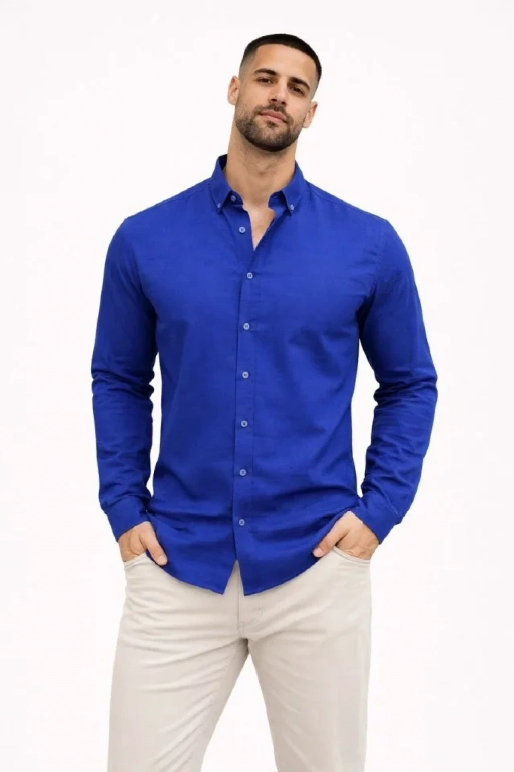 Erkek KETEN Kumaş Oversize Uzun Kollu Rahat Kalıp Gömlek - Saks Mavisi
