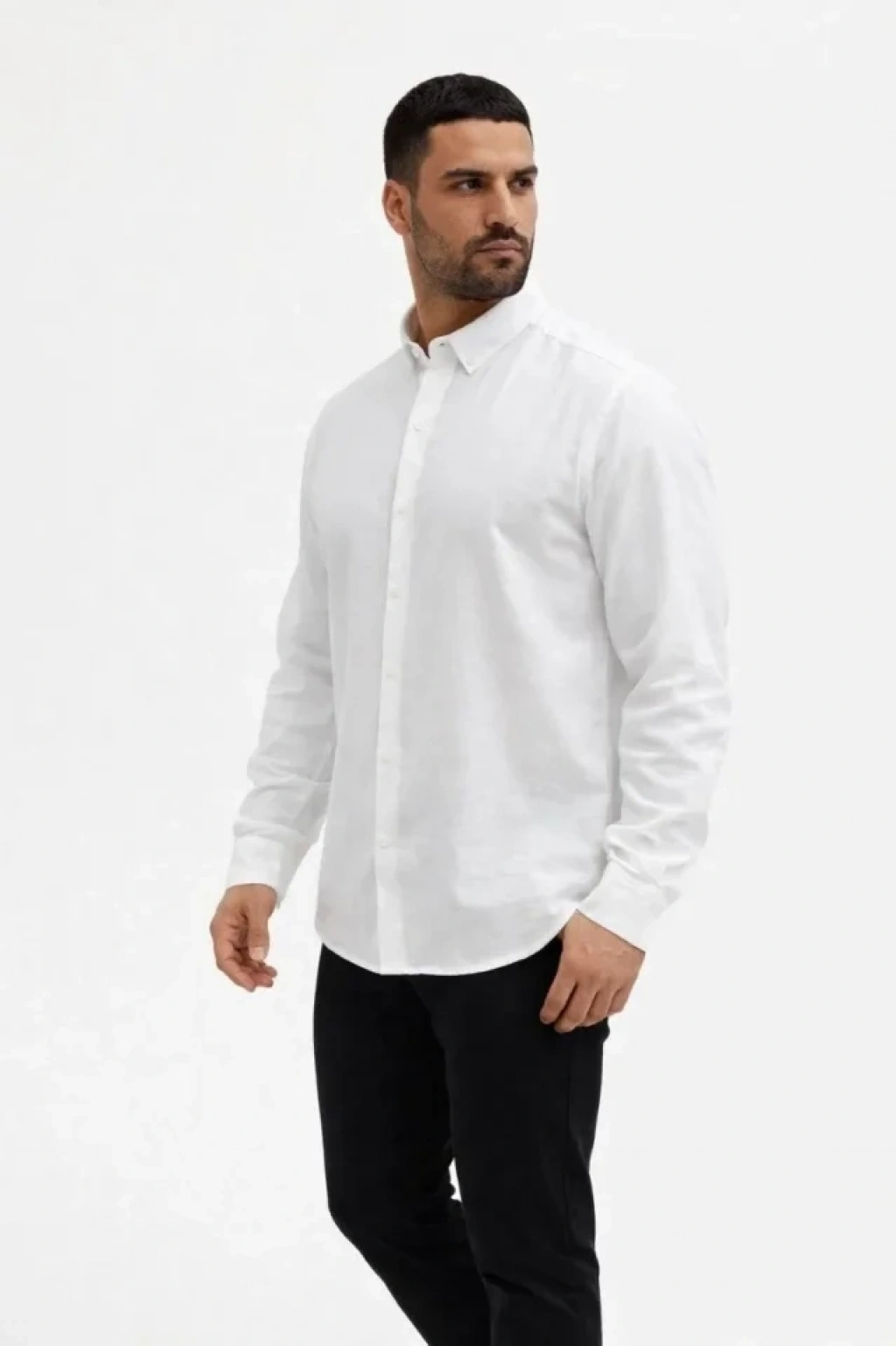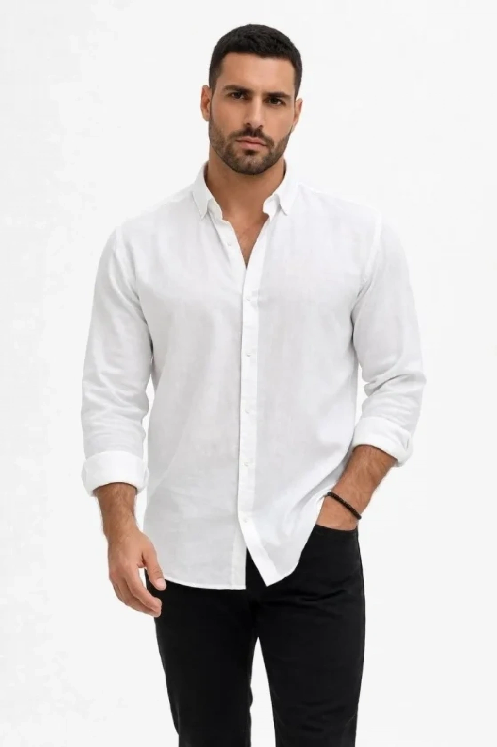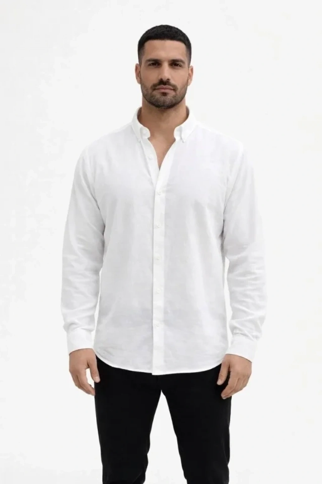Erkek KETEN Kumaş Oversize Uzun Kollu Rahat Kalıp Gömlek Beyaz