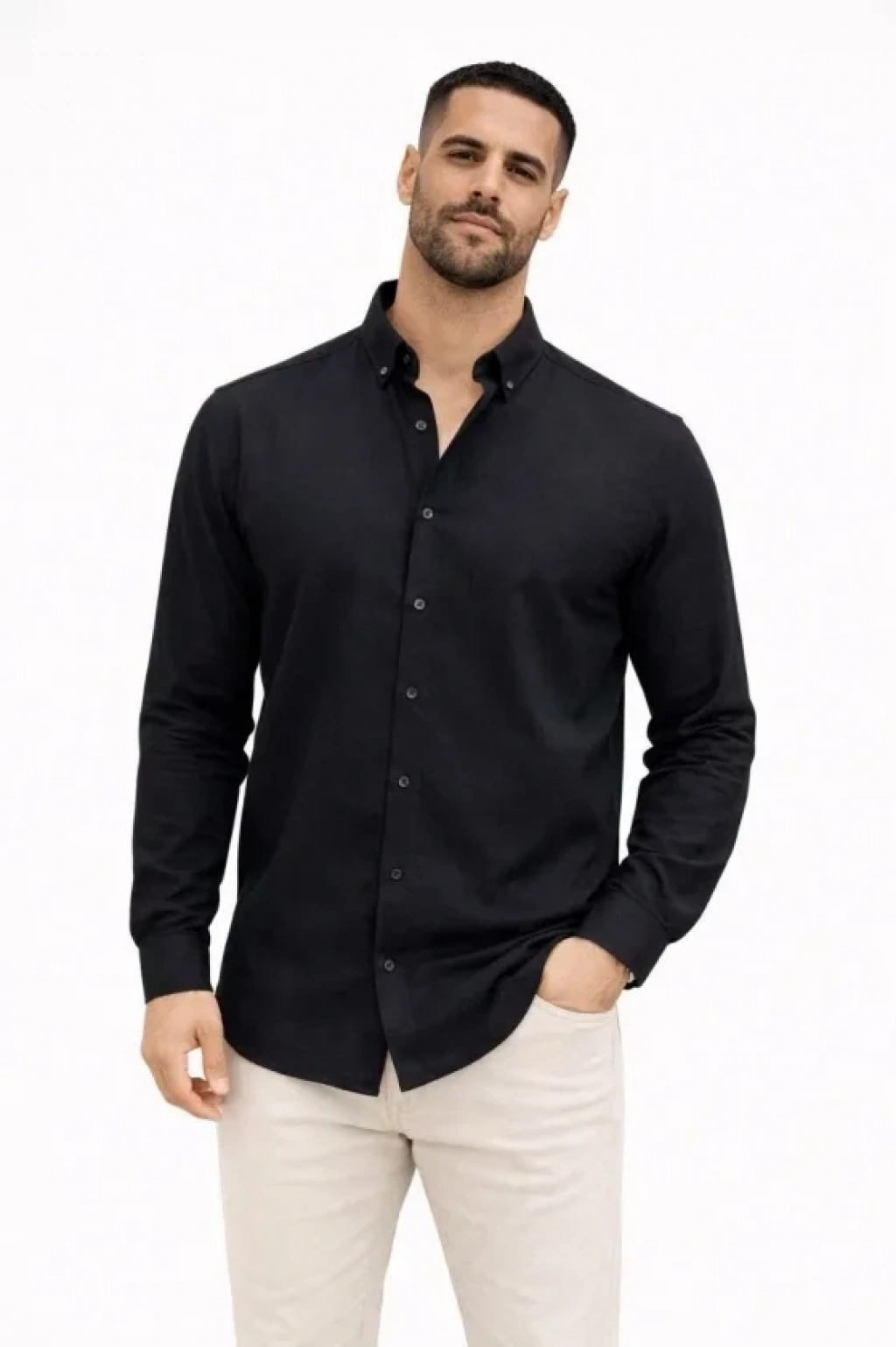 Erkek KETEN Kumaş Oversize Uzun Kollu Rahat Kalıp Gömlek - Siyah