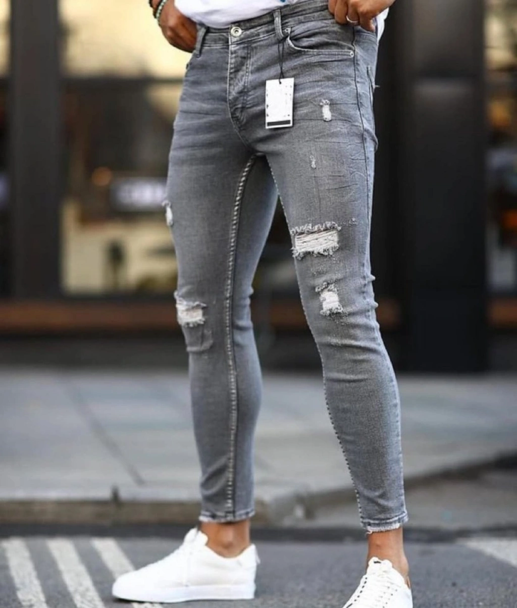 Erkek Koyu Gri Yırtık Detaylı Skinny Jean