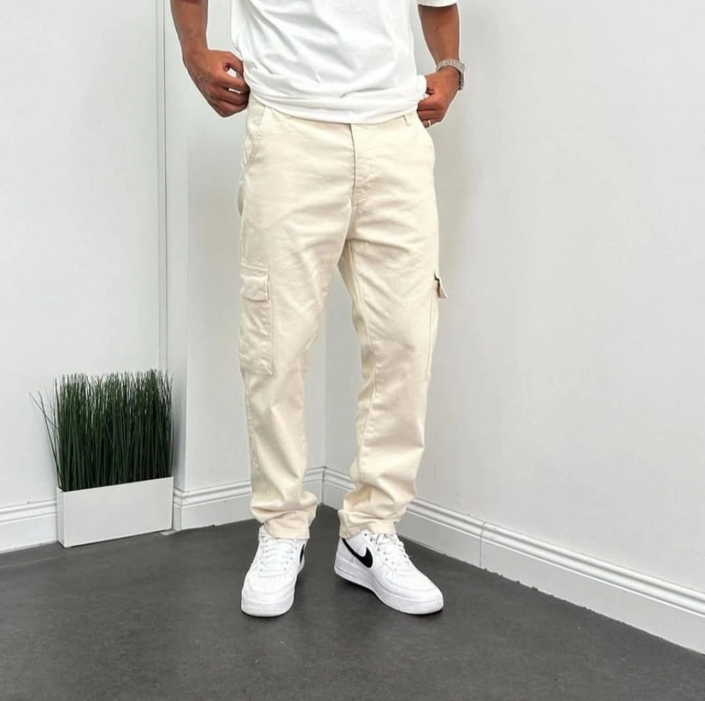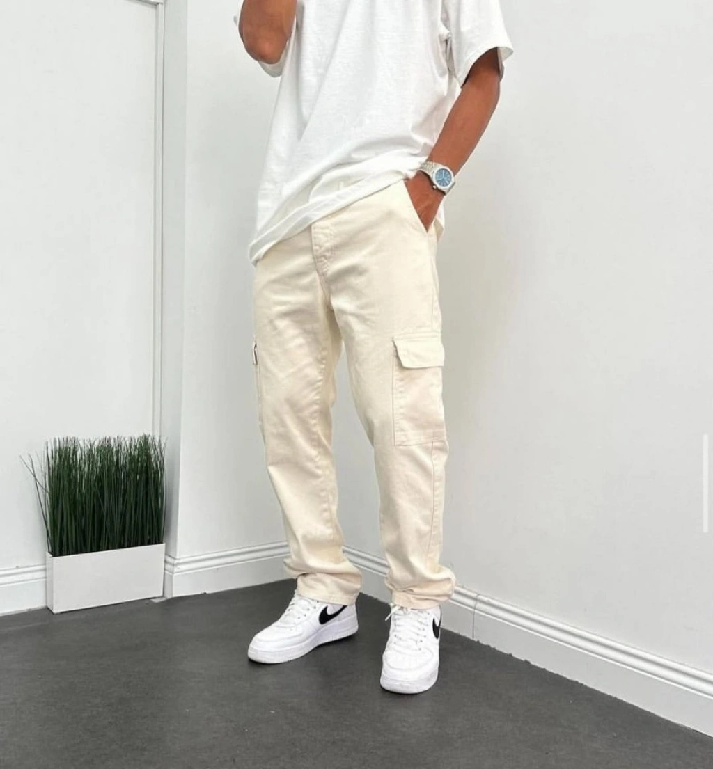 Erkek Krem Kargo Baggy Pantolon