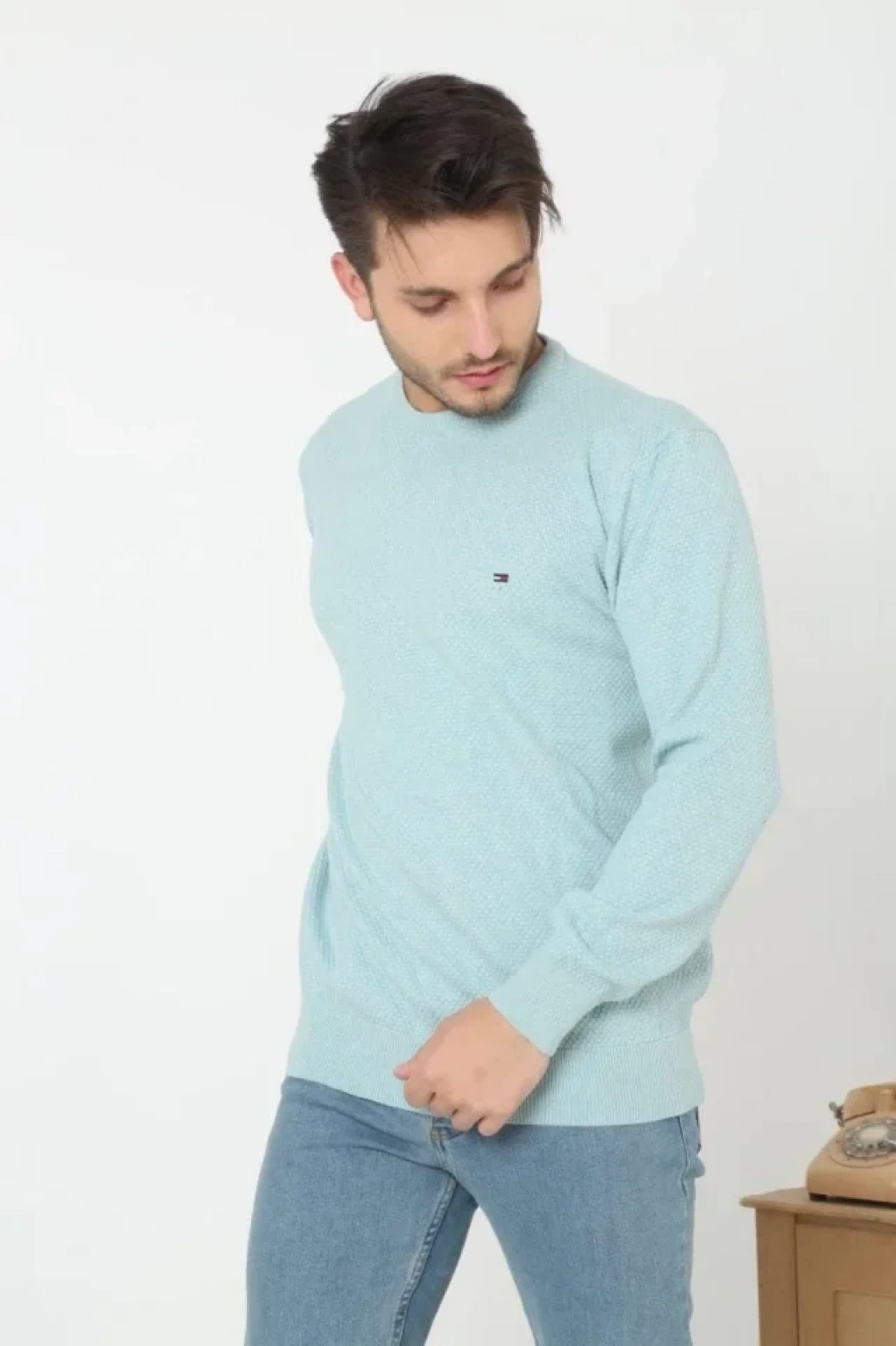 Erkek Nakış İşlemeli Peteli Triko Kazak Mavi
