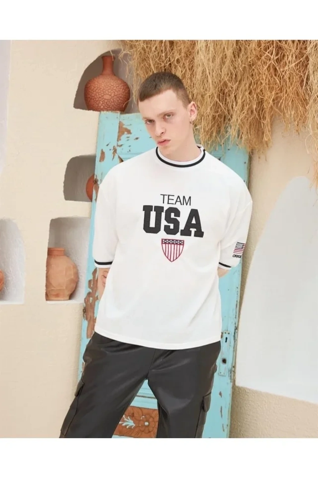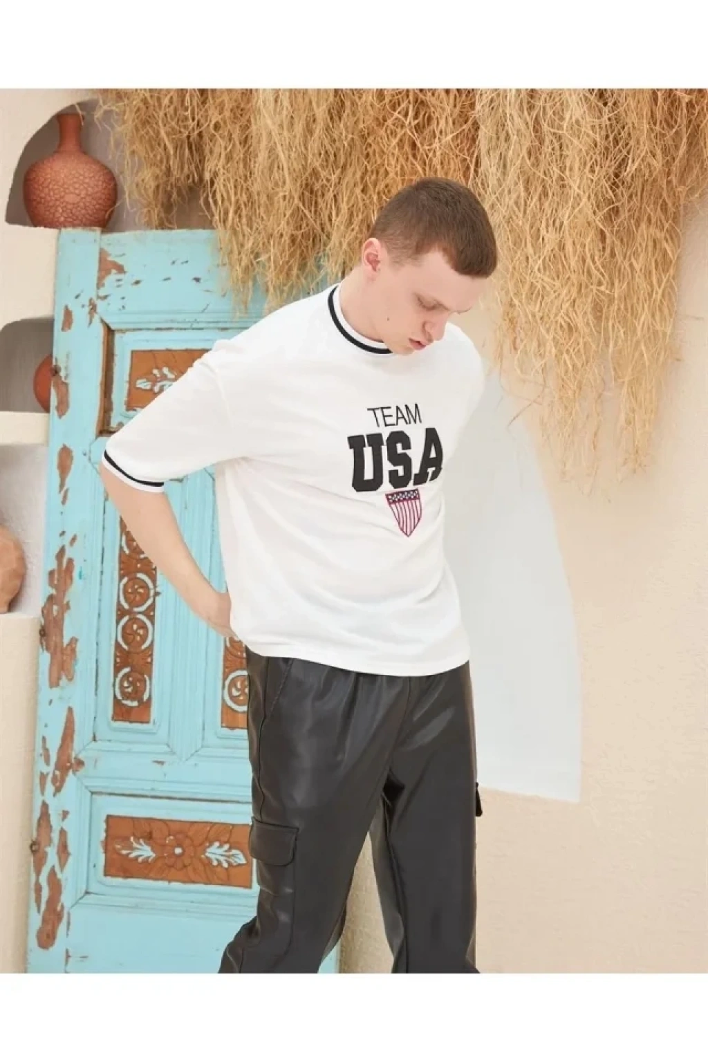 Erkek Nakış İşlemeli Ribanalı Oversize Tshirt Beyaz