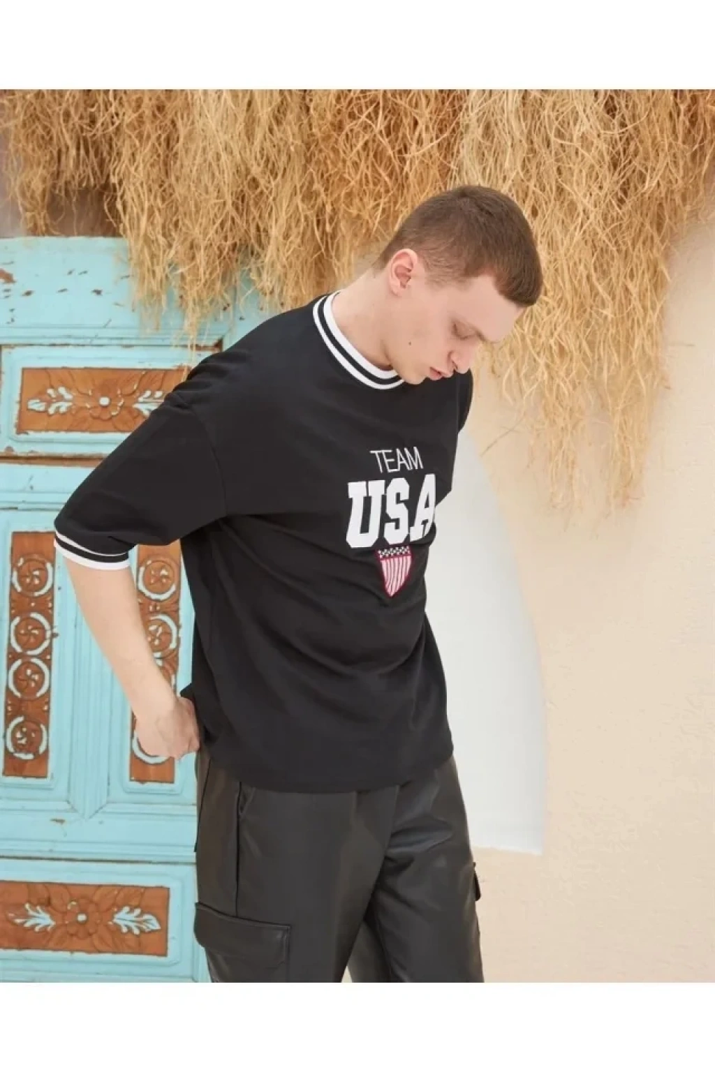 Erkek Nakış İşlemeli Ribanalı Oversize T-shirt - Siyah