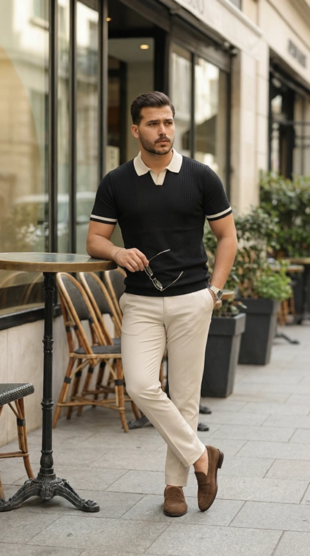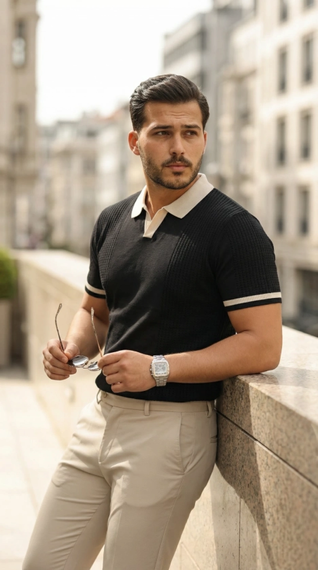 Erkek Kısa Kol Fitilli Triko Thirt Yazlık Hakim Yaka Tişört Bej