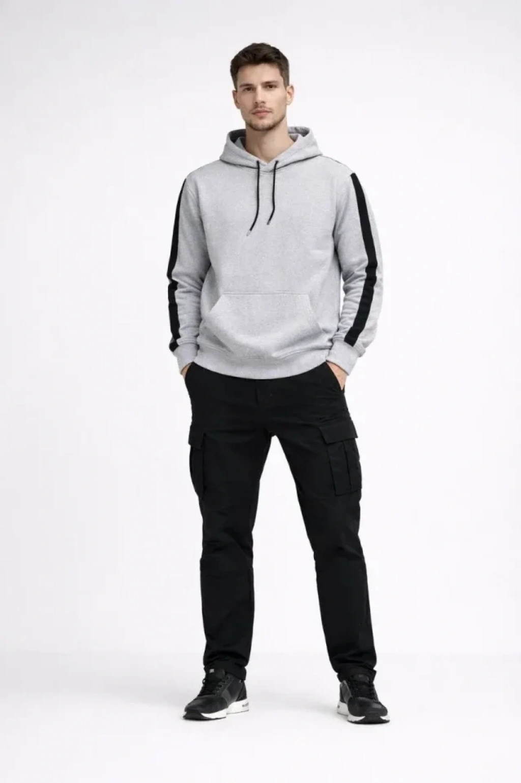 Erkek Şeritli Kapüşonlu weatshirt Oversize 3 Iplik Pamuklu iyah