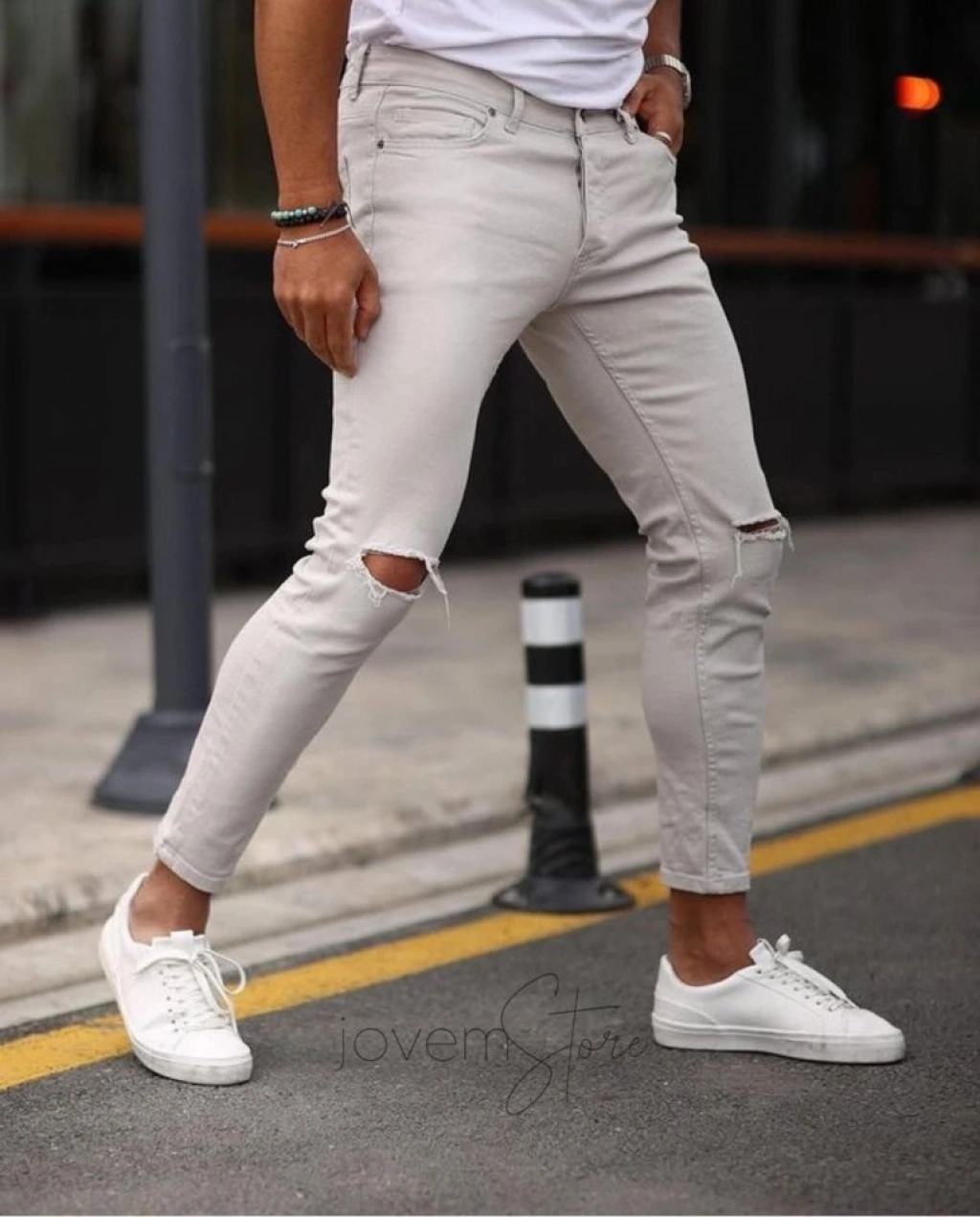 Erkek Açık Krem Yırtık Detaylı Boyfriend Jean
