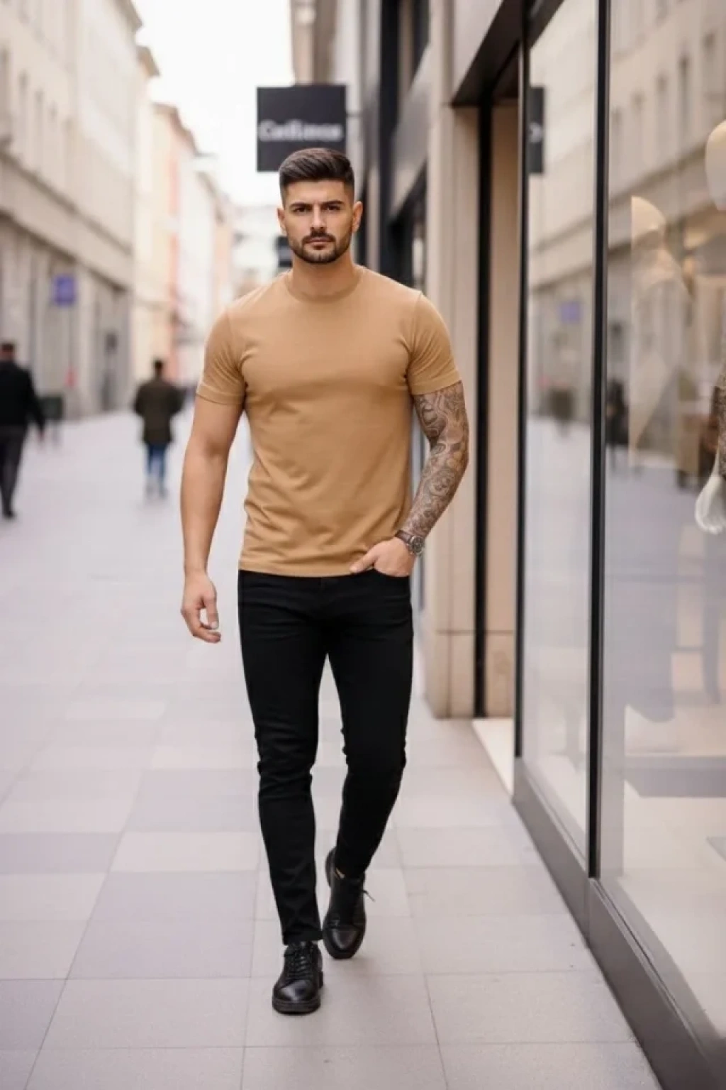 Erkek Thirt Bisiklet Yaka lim Fit Dar Kesim ikralı Tişört Günlük Basic Body Kahverengi