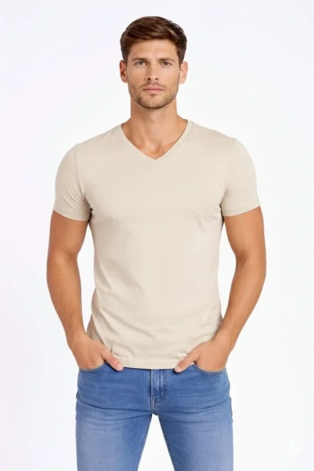 Erkek T-Shirt V Yaka Slim Fit Dar Kesim Likralı Tişört Günlük Basic Body - Taş