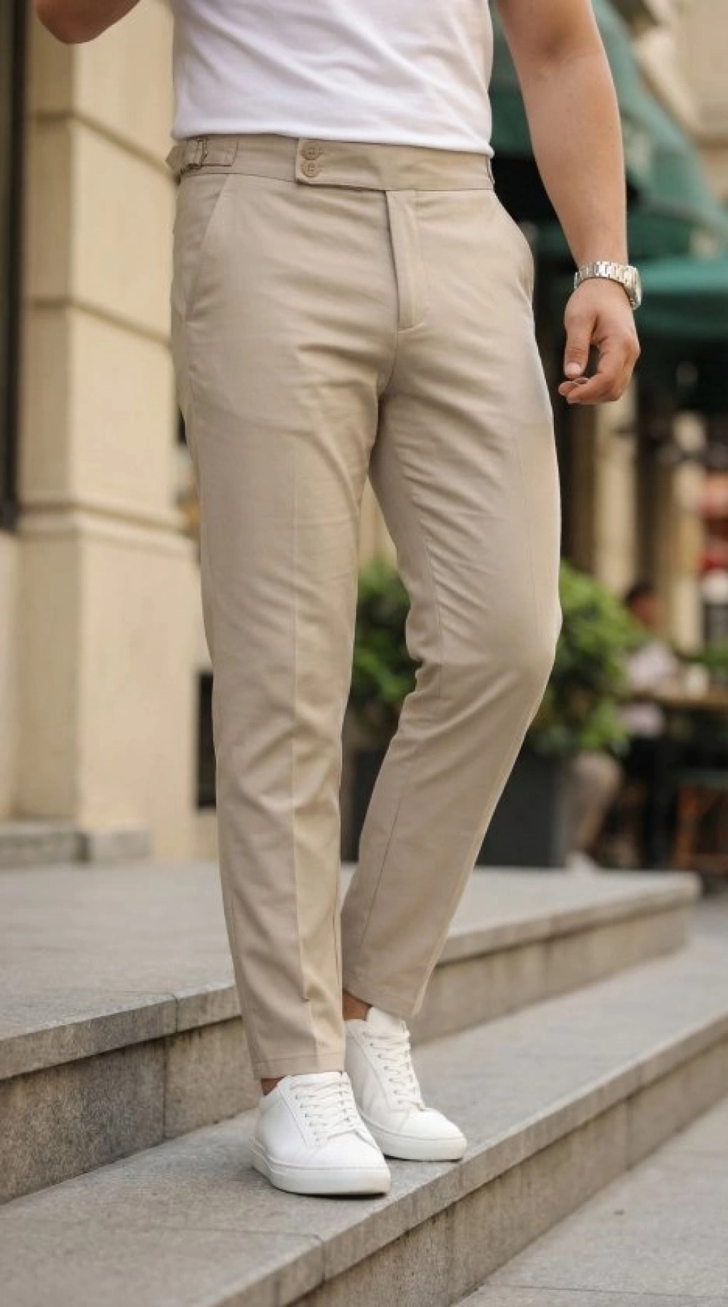 Erkek Diagonel ikro Dokulu Duble Paça Cepli Pantolon Bağcıklı Bel, odern Kesim Krem