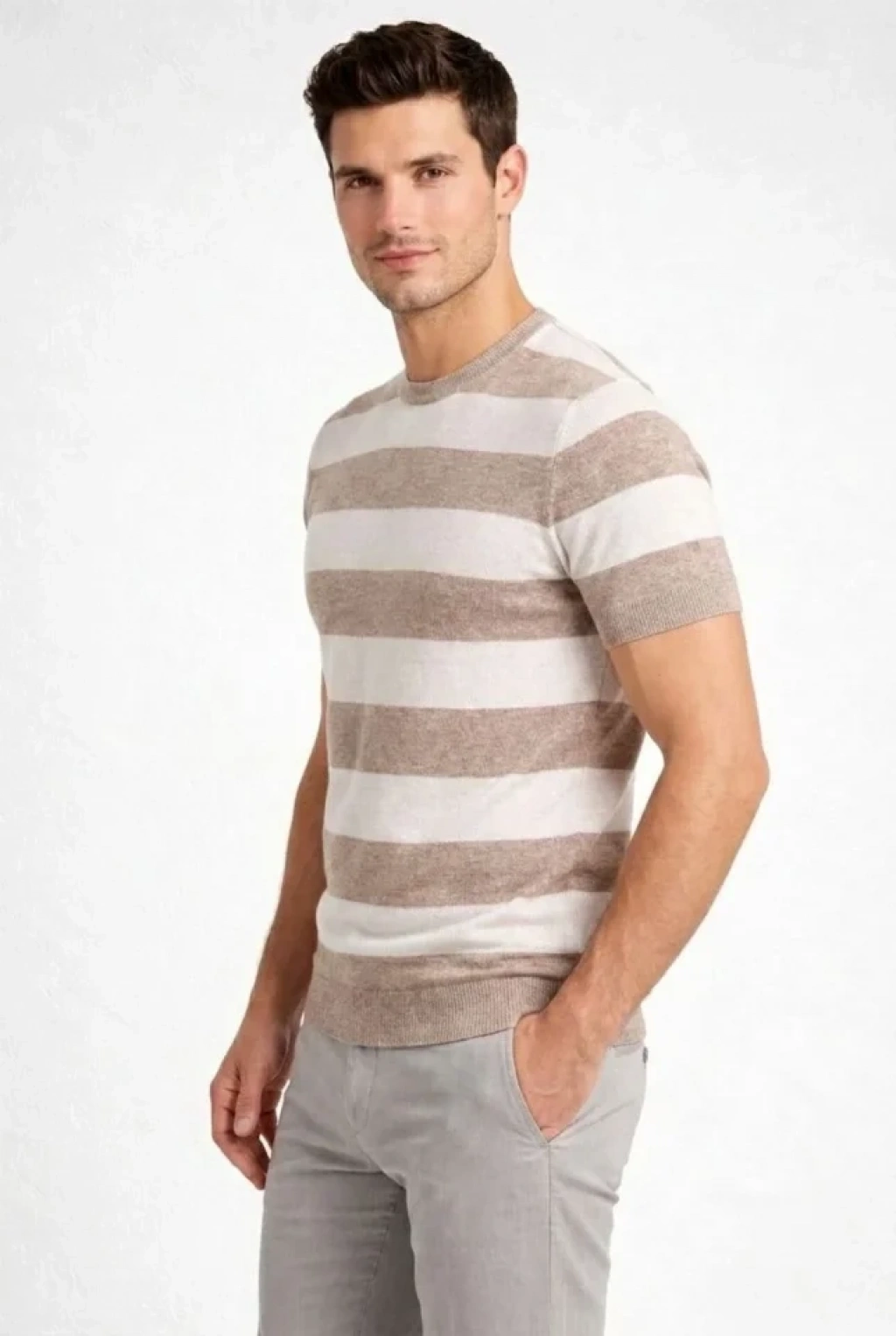 Erkek Tshirt Çizgili Triko Dokuma Bisiklet Yaka Tişört Bej