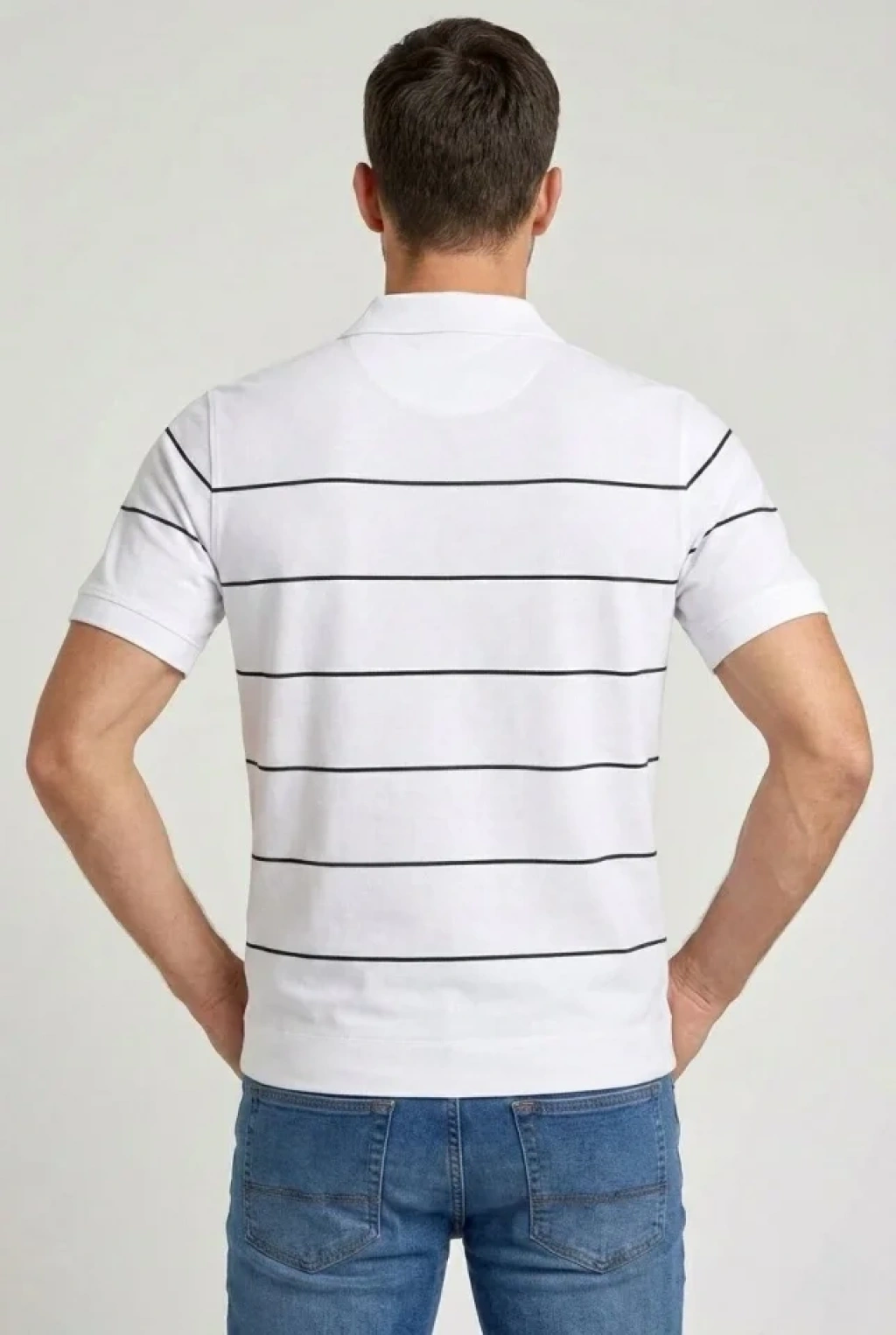 Erkek Tshirt Çizgili Triko Dokuma Kumaş Polo Yaka Yarım Fermuarlı Regular Kalıp Tişört Beyaz