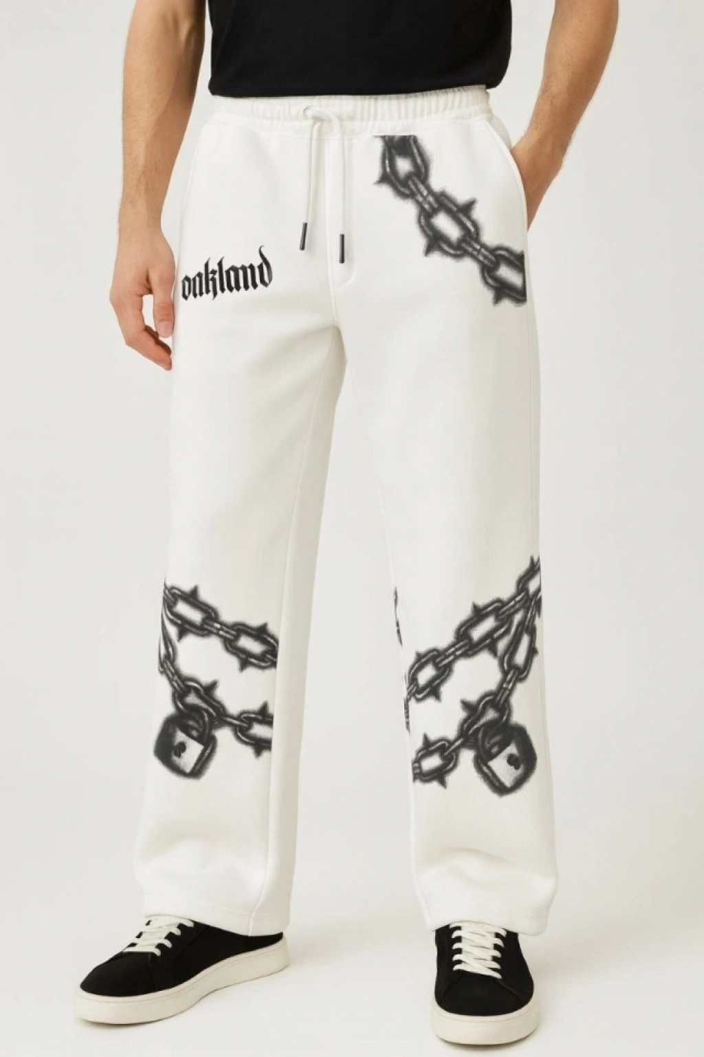 Erkek Üç İplik Pamuklu Baskılı Cepli Jogger Buggy Pantalon Oversize Kalıp Beyaz