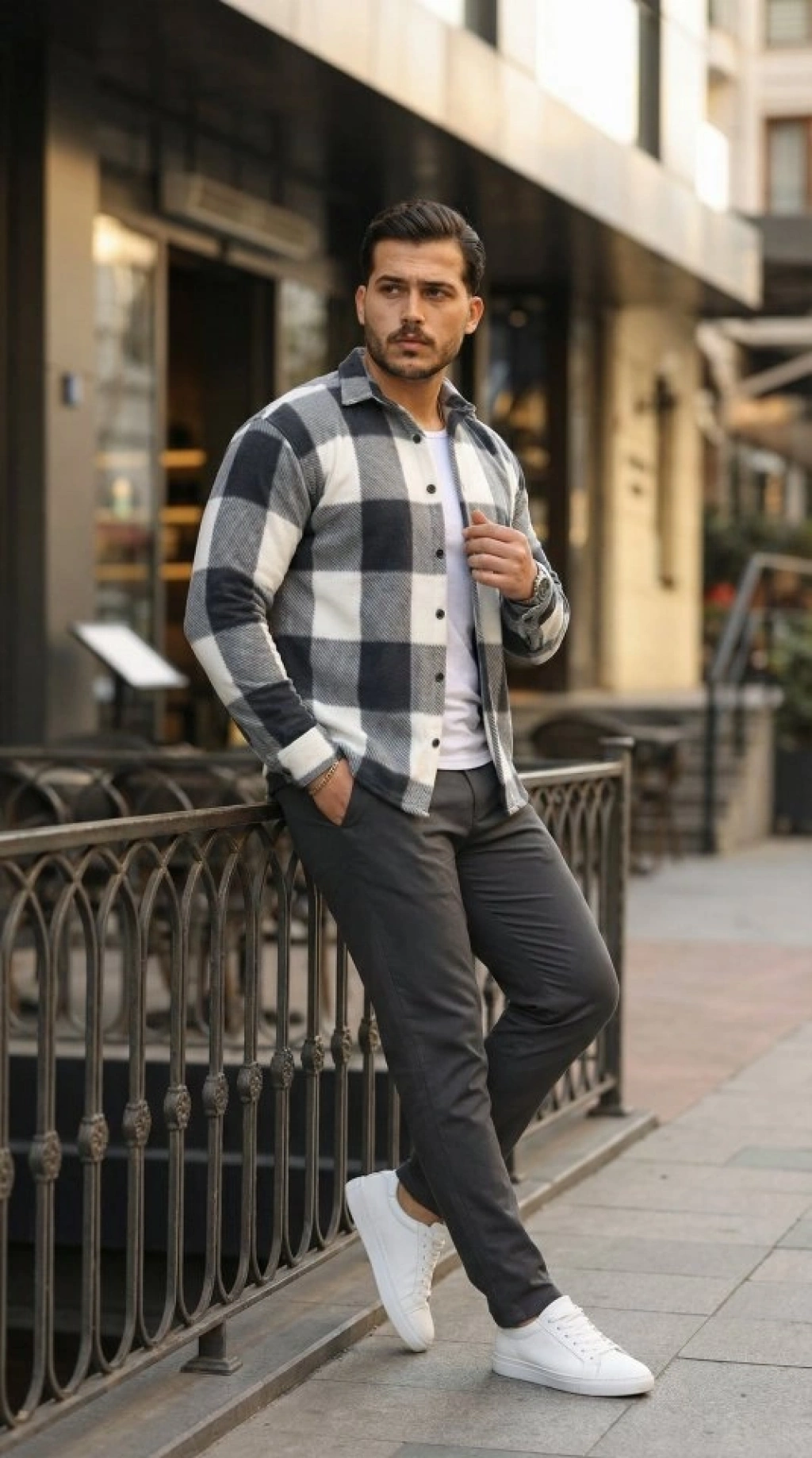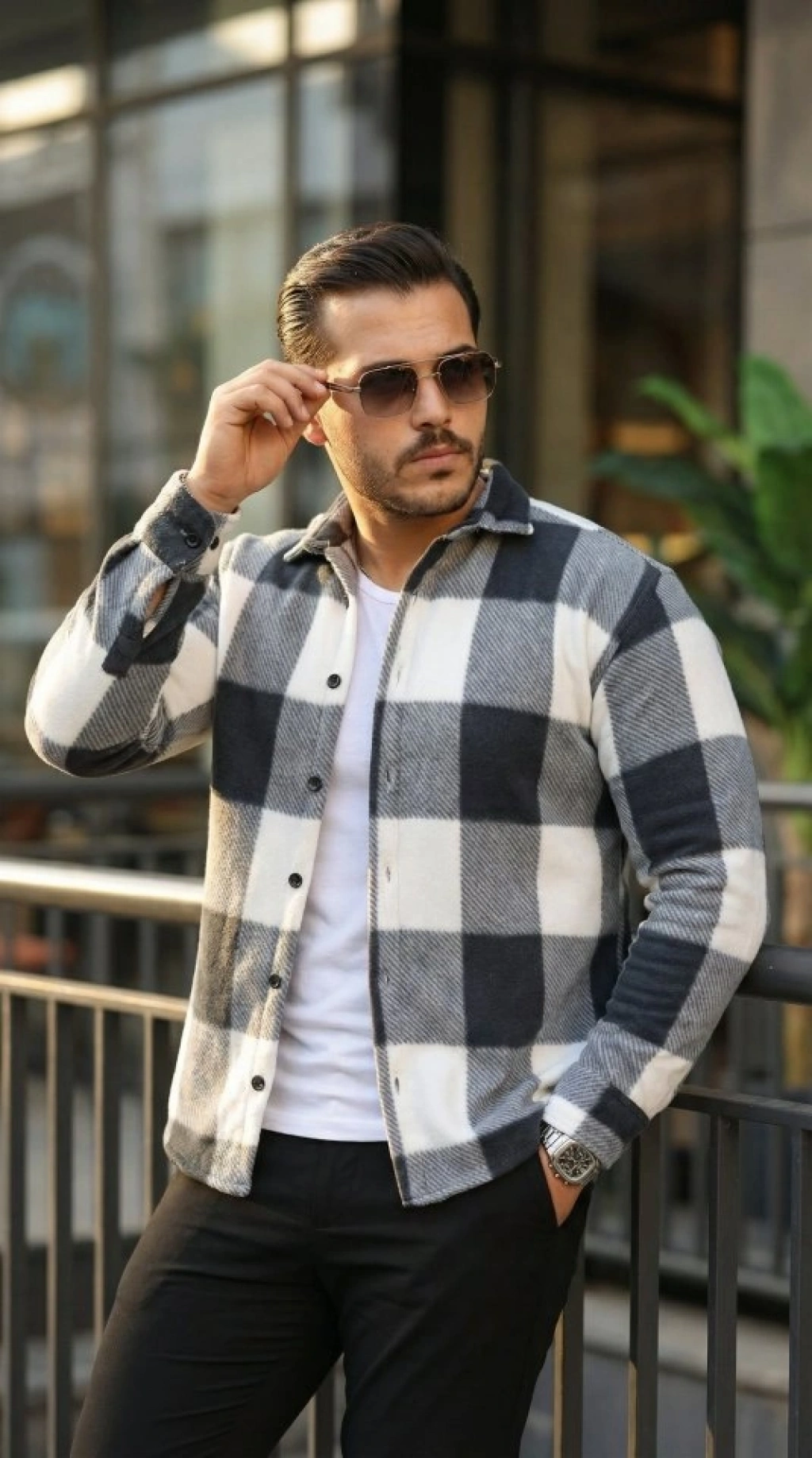 Erkek Waffle Dokuma Açık Yakalı Düğmeli Regular Kalıp 2’li Gömlek eti Beyaz Gri