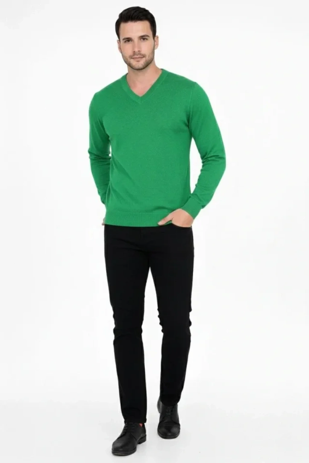 Erkek V Yaka Triko Kazak Yumuşak Dokulu Pamuklu Ince Dokuma, Uzun Kollu Rahat Regular Kalıp - Çimen Yeşili