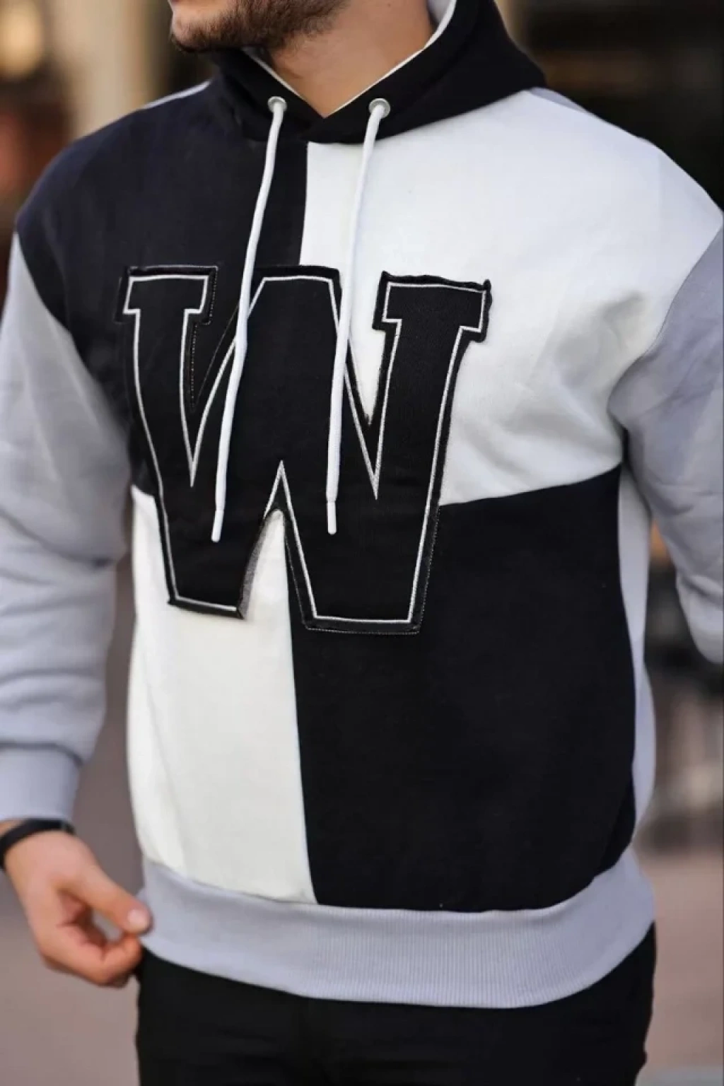 Erkek W Nakış İşlemeli Kapüşonlu Sweatshirt - Siyah