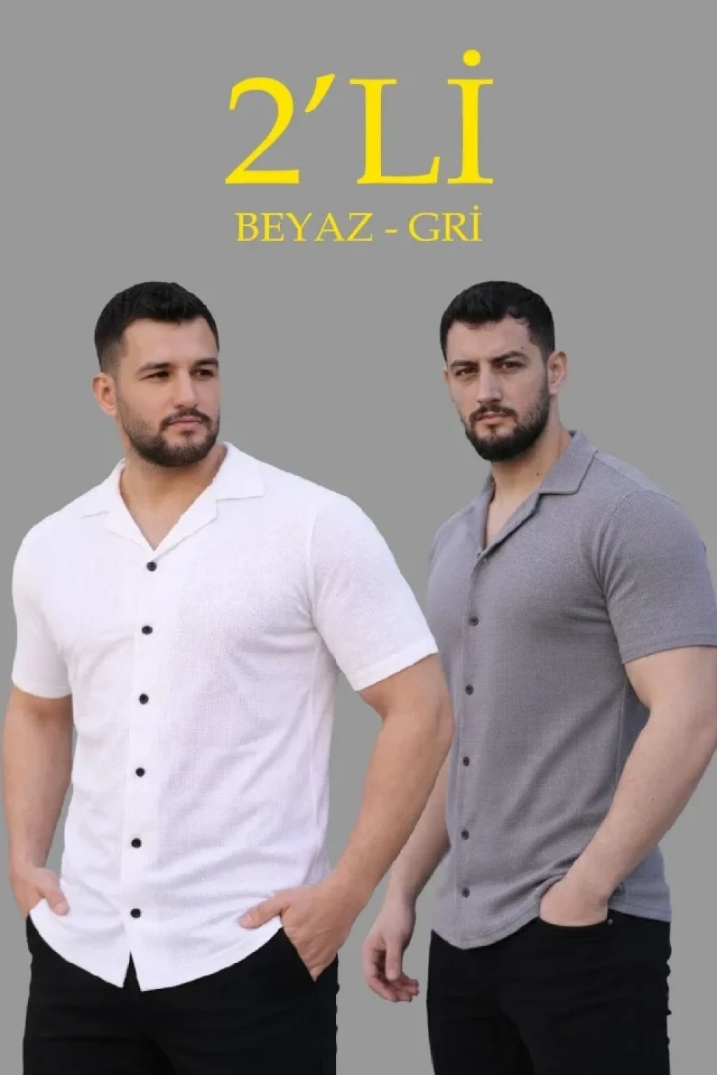 Erkek Waffle Dokuma Açık Yakalı Düğmeli Regular Kalıp 2’li Gömlek eti Beyaz Gri