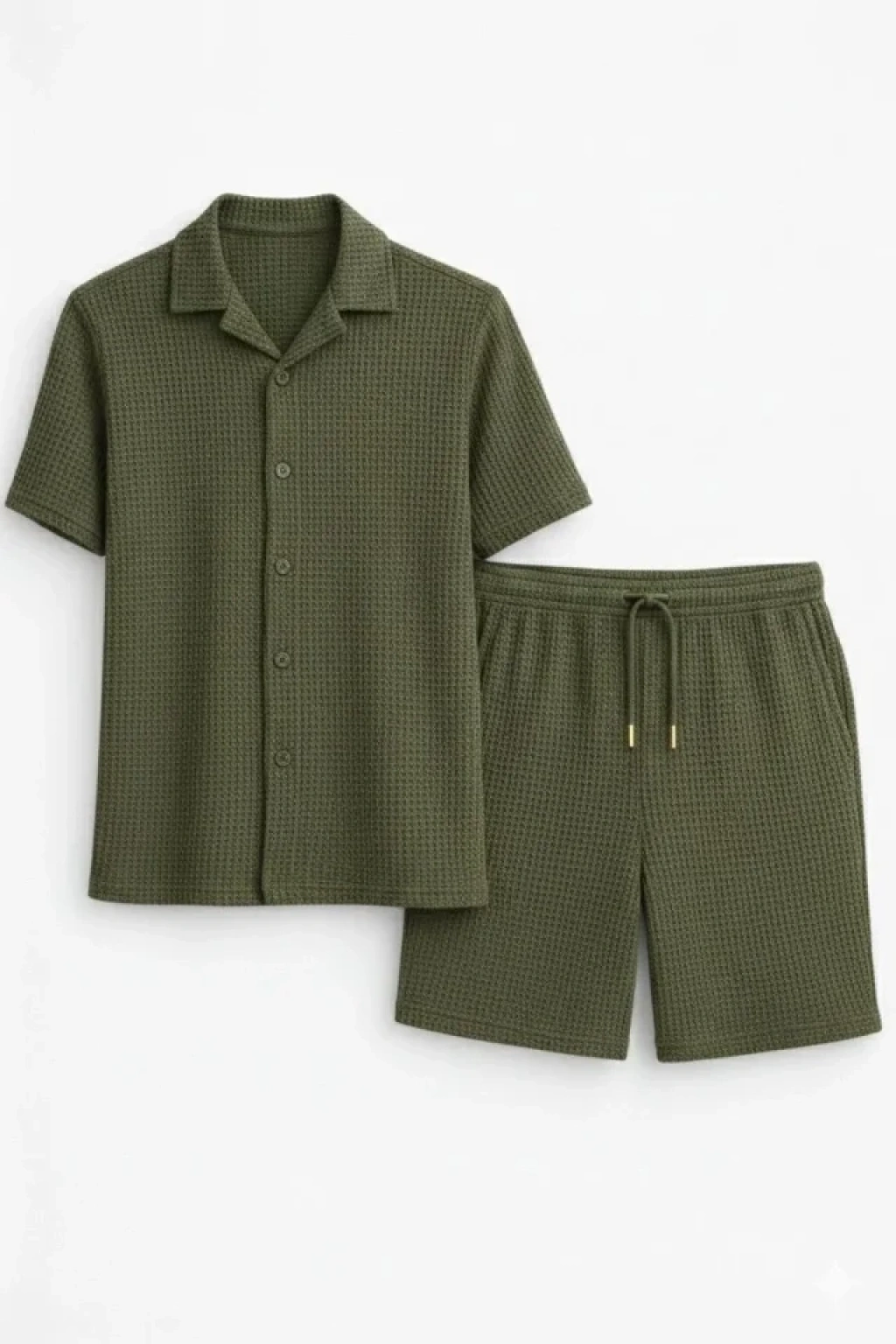 Erkek Waffle Kumaş Kısa Kollu Gömlek Şort Takım Regular Fit Yazlık İkili et Haki