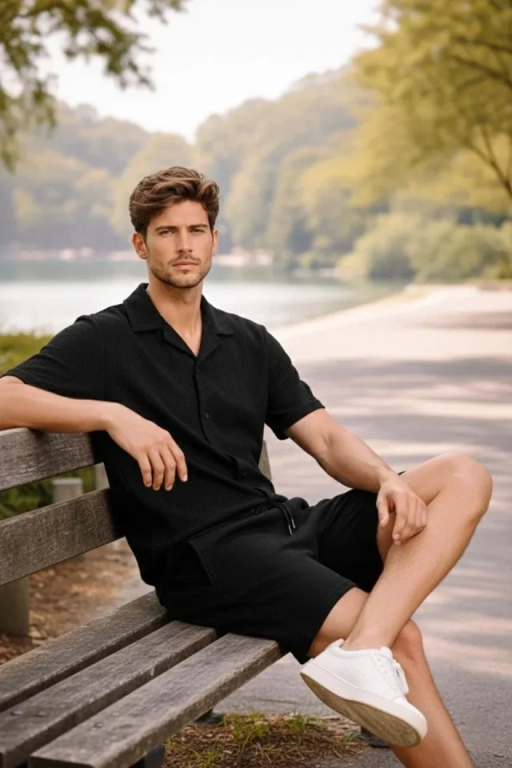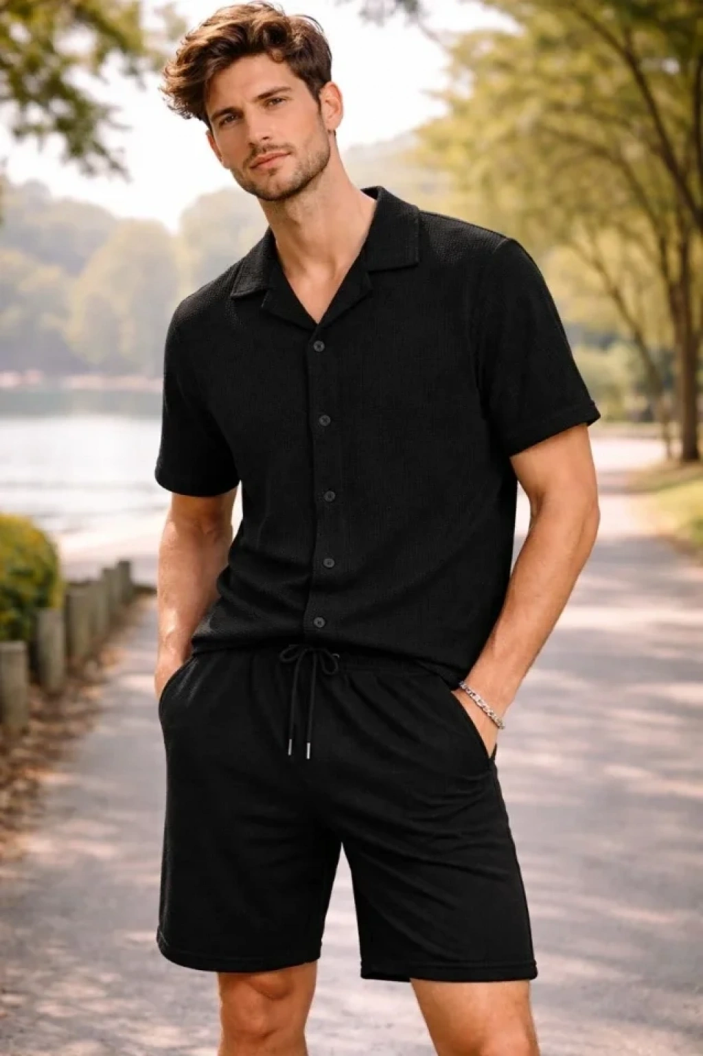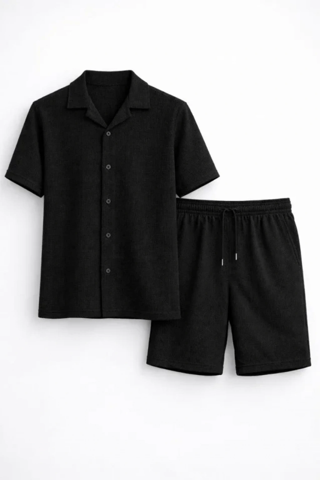 Erkek Waffle Kumaş Kısa Kollu Gömlek Şort Takım Regular Fit Yazlık İkili Set - Siyah