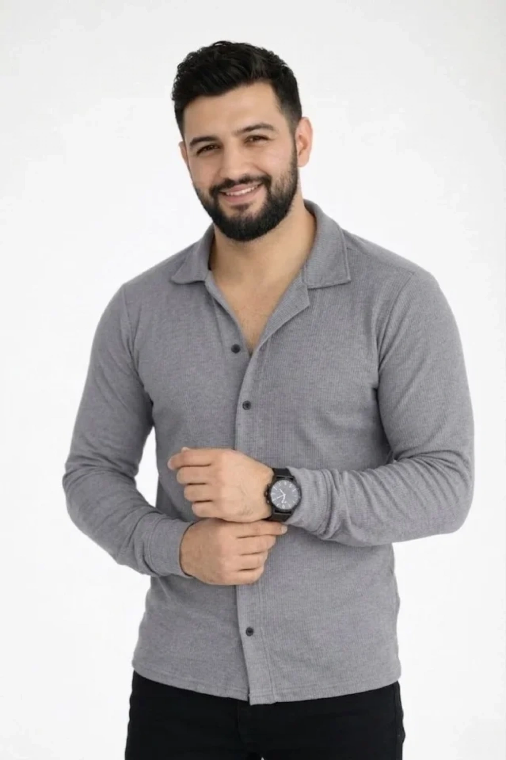 Erkek Waffle Kumaş Uzun Kollu Düğmeli Açık Yaka Regular Fit Gömlek aks avisi