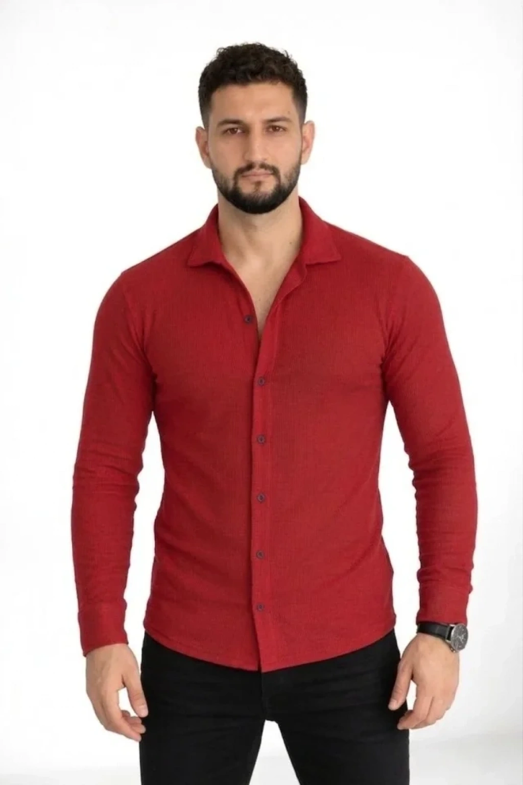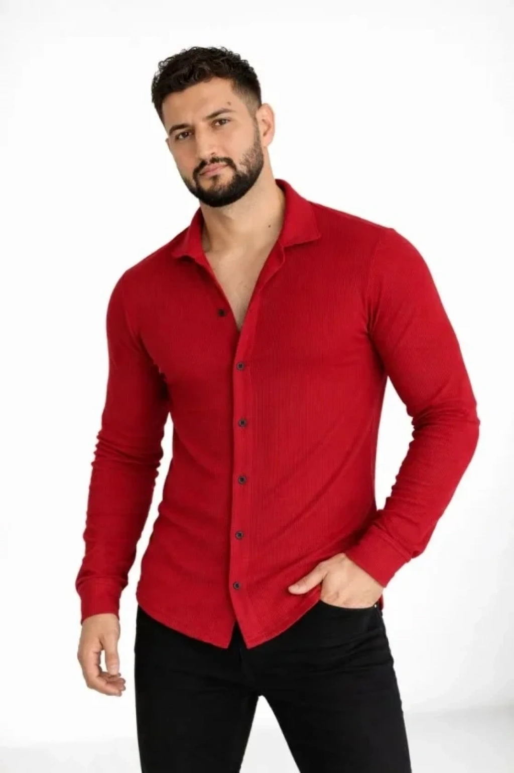 Erkek Waffle Kumaş Uzun Kollu Düğmeli Açık Yaka Regular Fit Gömlek Kırmızı