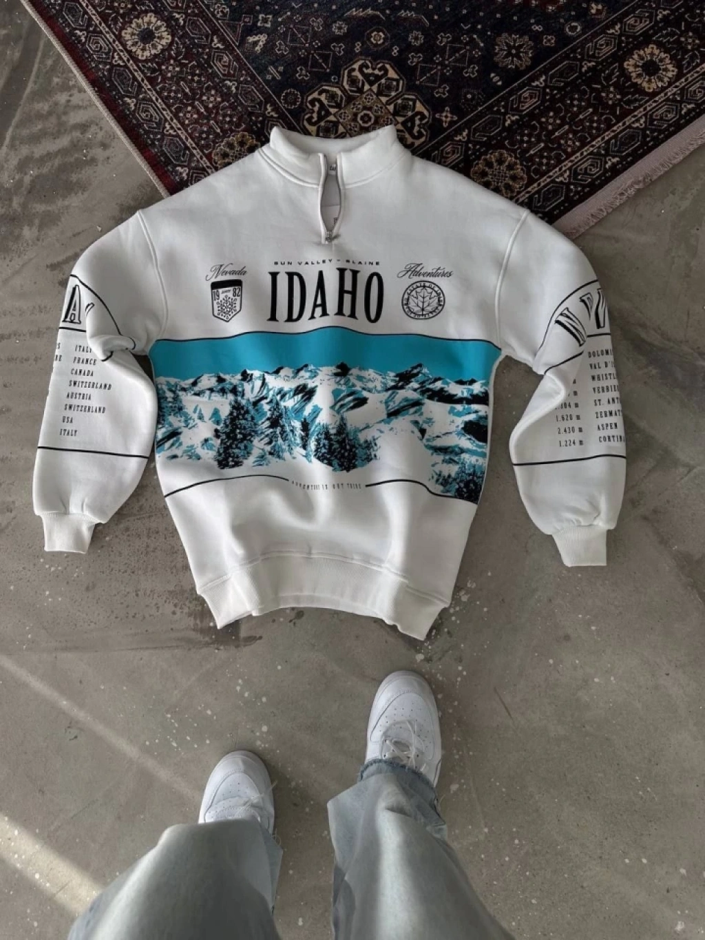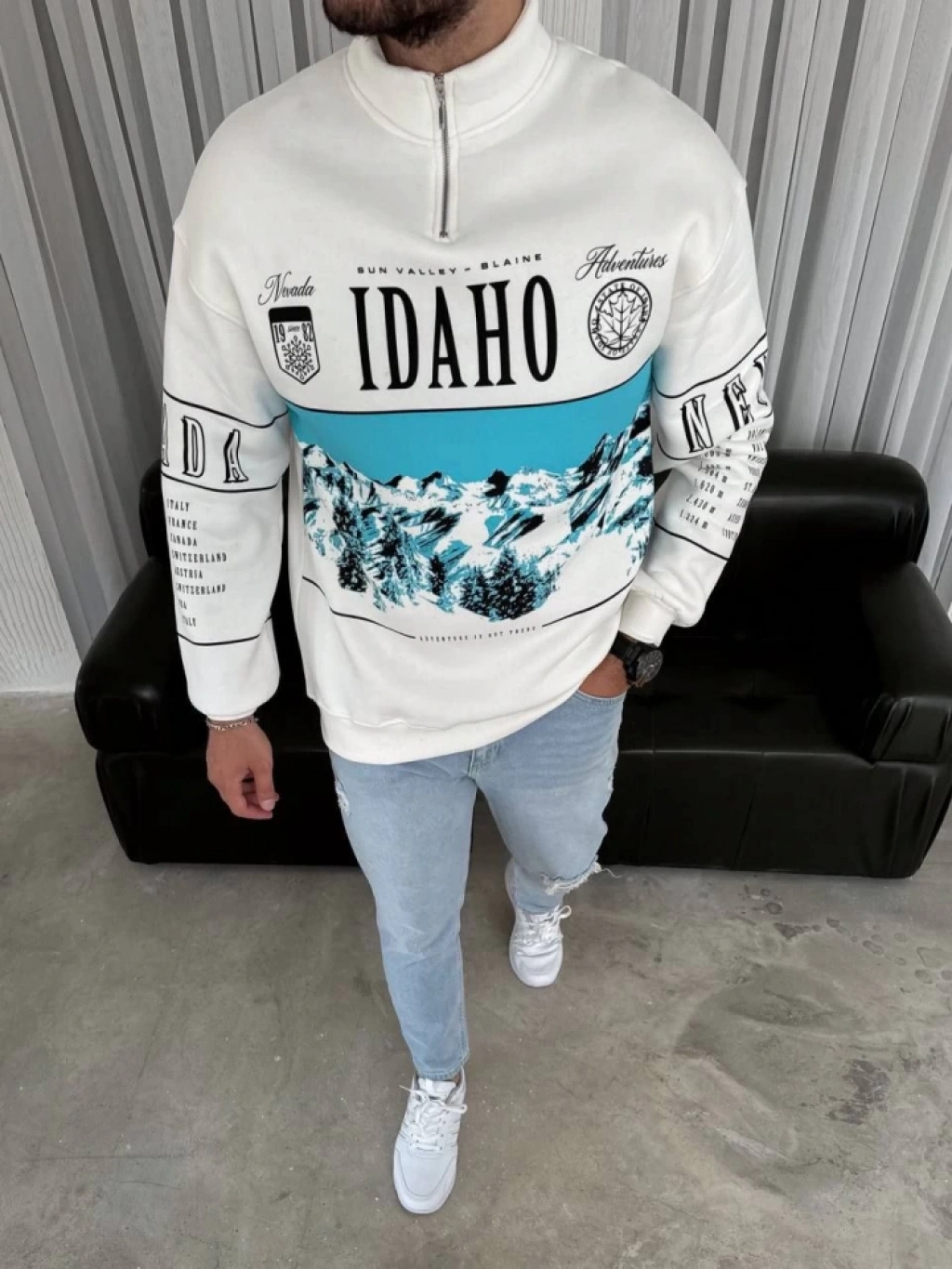 Erkek Yarım Fermuarlı Oversize Baskılı weathirt Beyaz