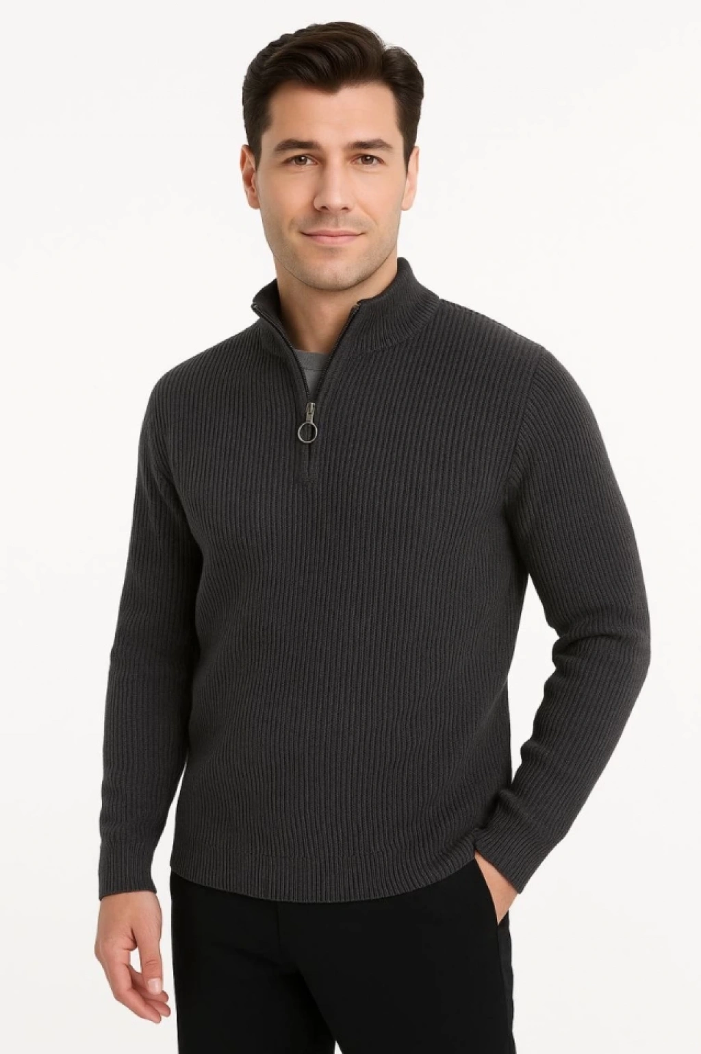 Erkek Yarım Fermuarlı Triko Kazak – Selanik Örgü, Dik Yaka, Pamuklu Dokuma, Regular Fit Uzun Kollu Kışlık Model - Füme