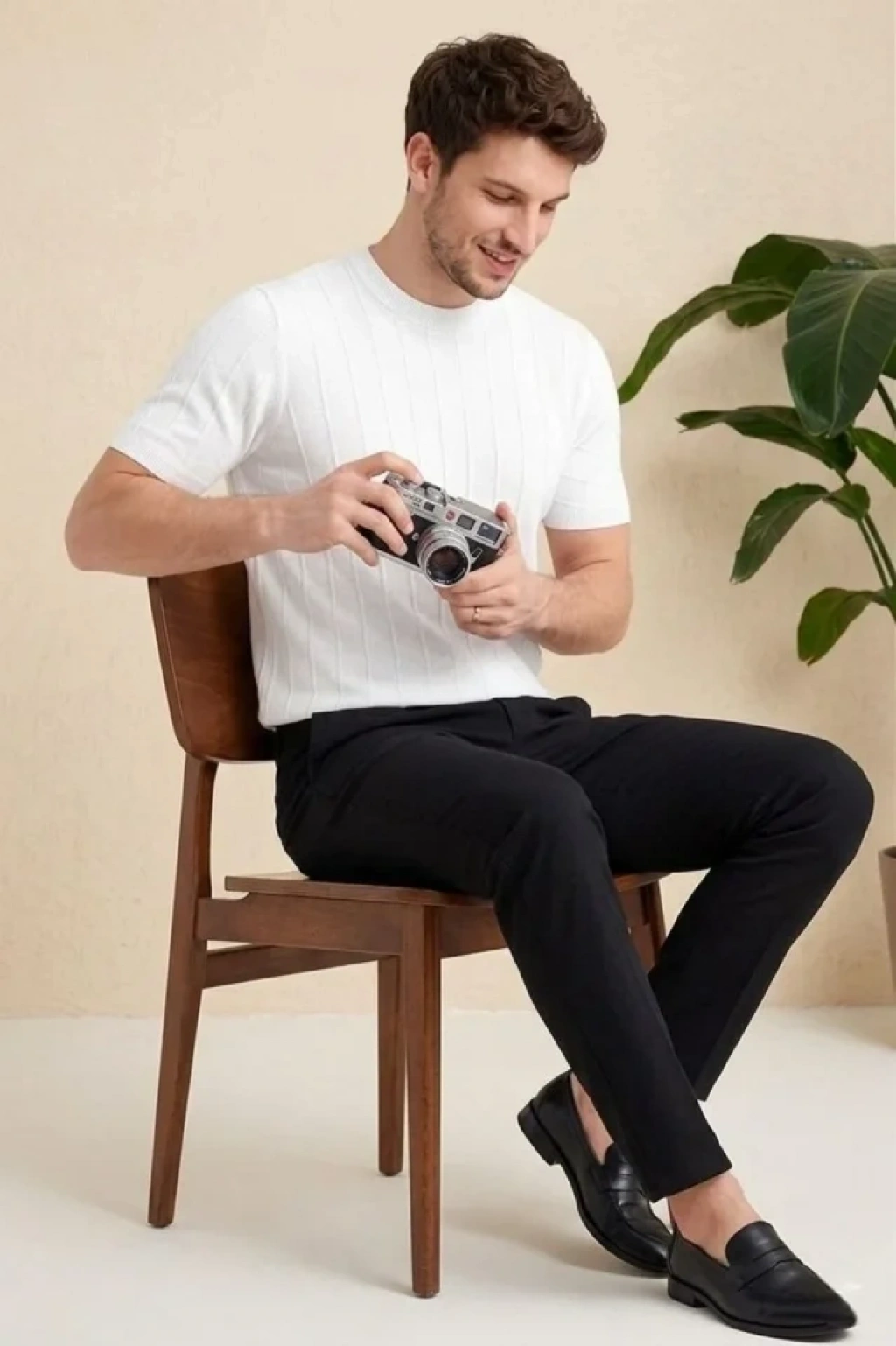 Erkek Kısa Kol Fitilli Triko Thirt Yazlık Hakim Yaka Tişört Bej