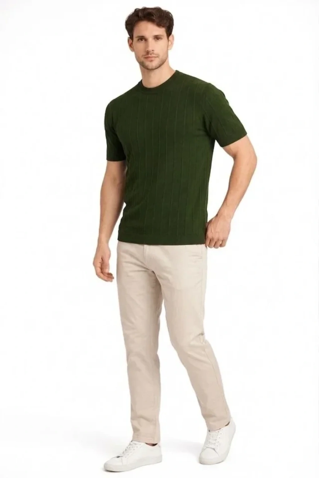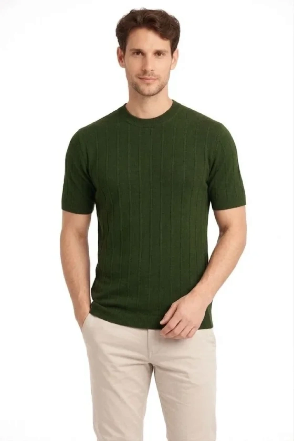 Erkek Yazlık Fitilli Triko Tişört Kısa Kol Bisiklet Yaka Thirt Haki