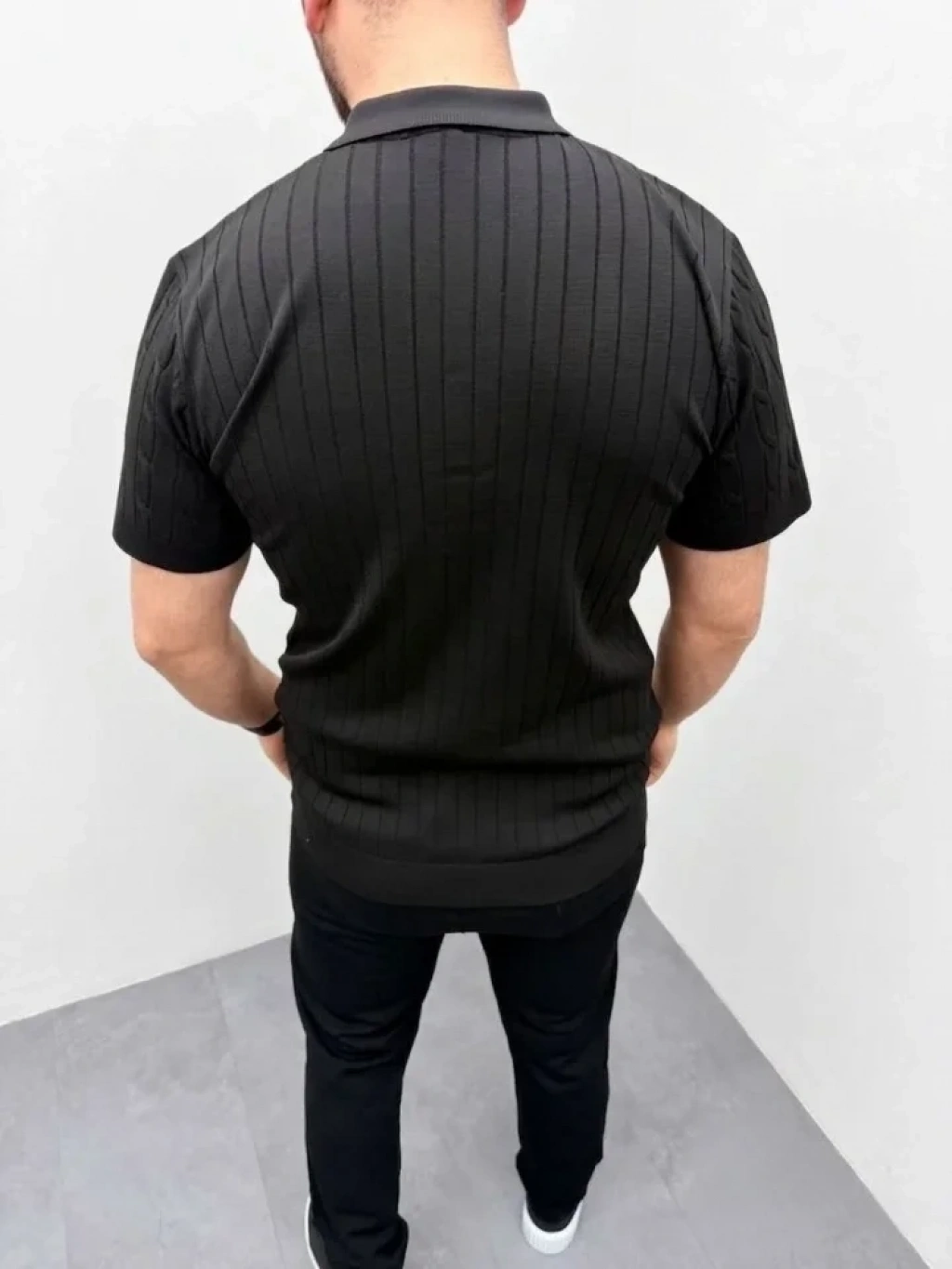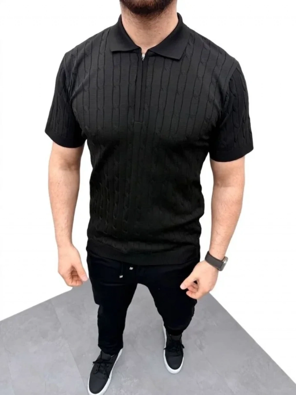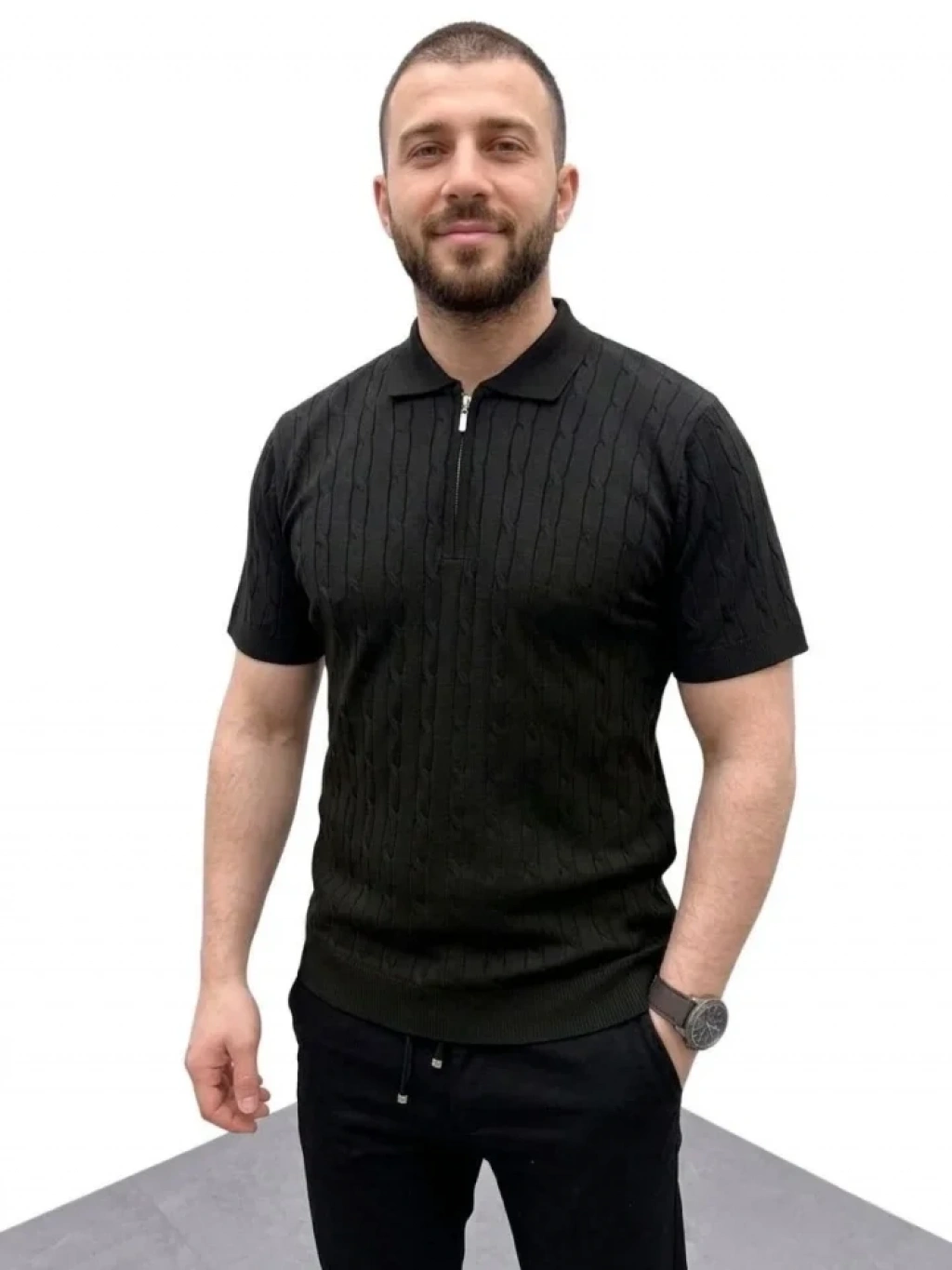 Erkek Yazlık Triko Saç Örgü Tişört Kısa Kol Polo Yaka Fermuarlı T-Shirt - Siyah