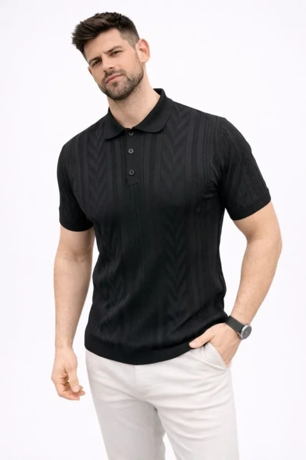 Erkek Yazlık Triko Tişört Kısa Kol Polo Yaka Düğmeli Thirt iyah