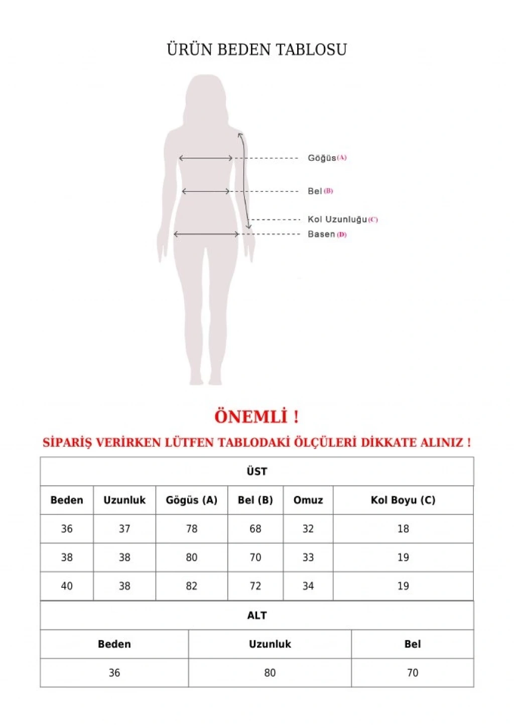 Modelin Ölçüleri: Boy:165, Kg:55, Göğüs:90, Bel:72, Kalça: 100