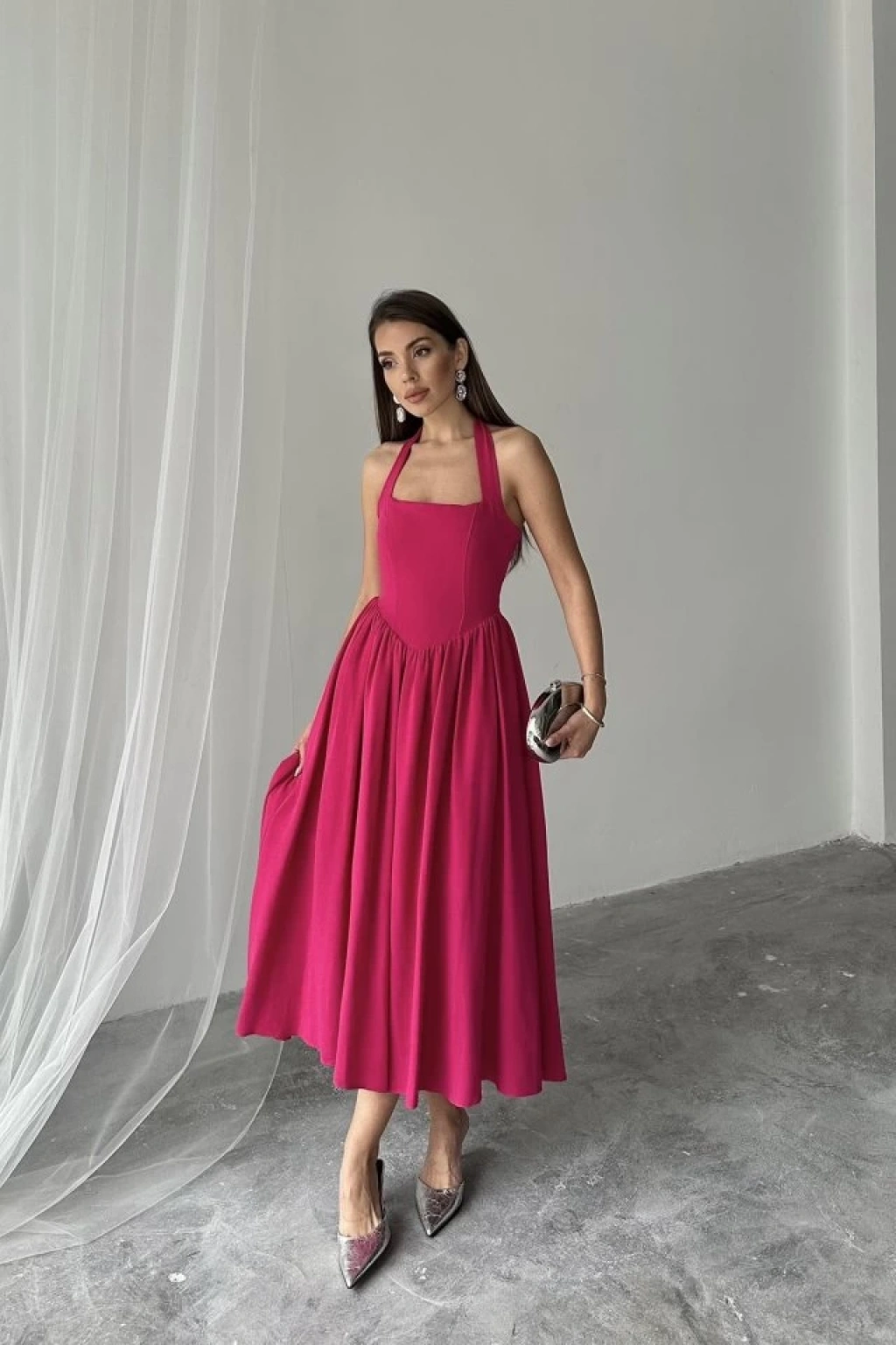 Fuşya Boyundan Bağlamalı Keten Elbise