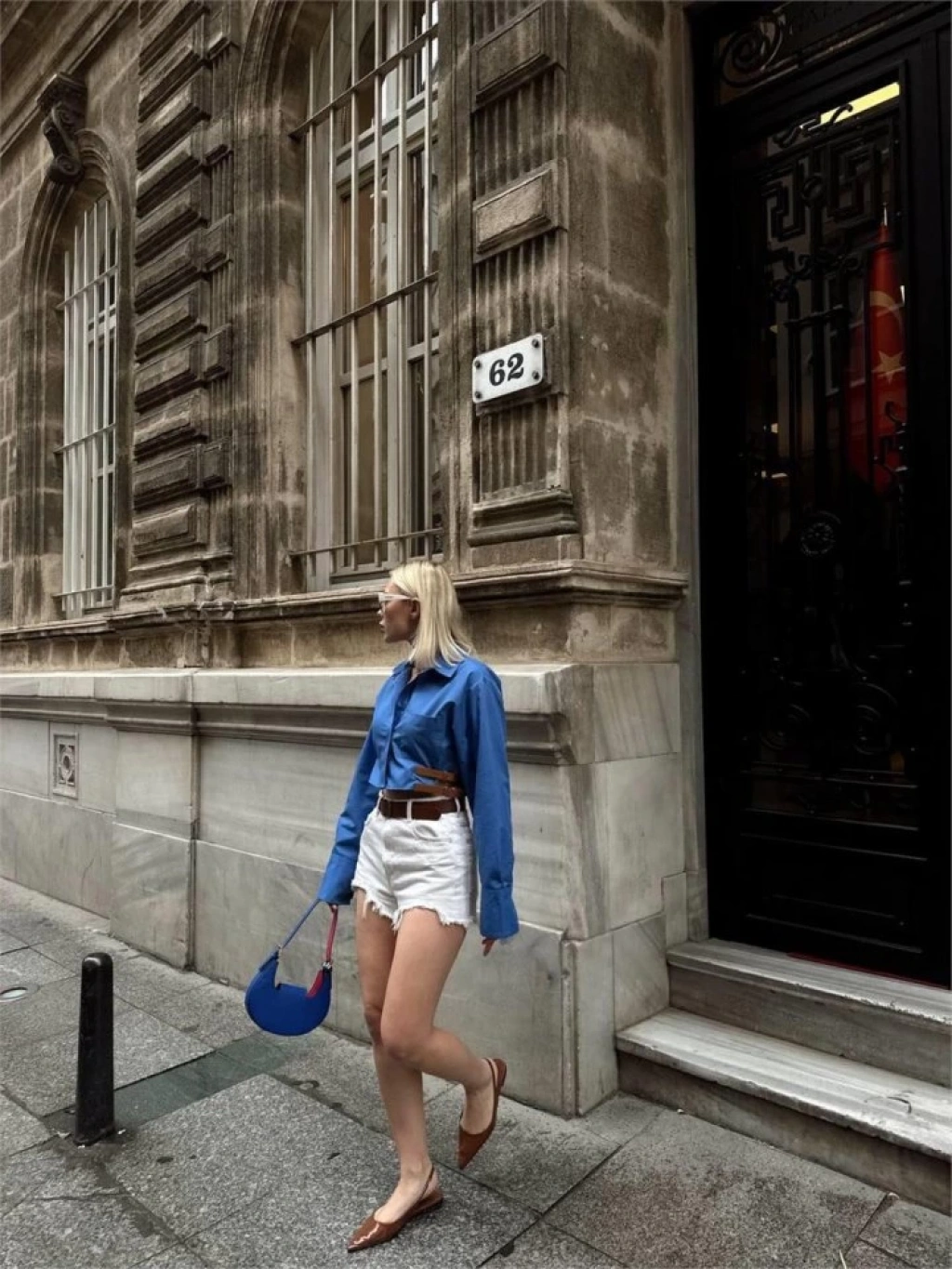 GÖMLEK POPLİN CROP YAN ÇİFT KEMER DETAYLI - Mavi