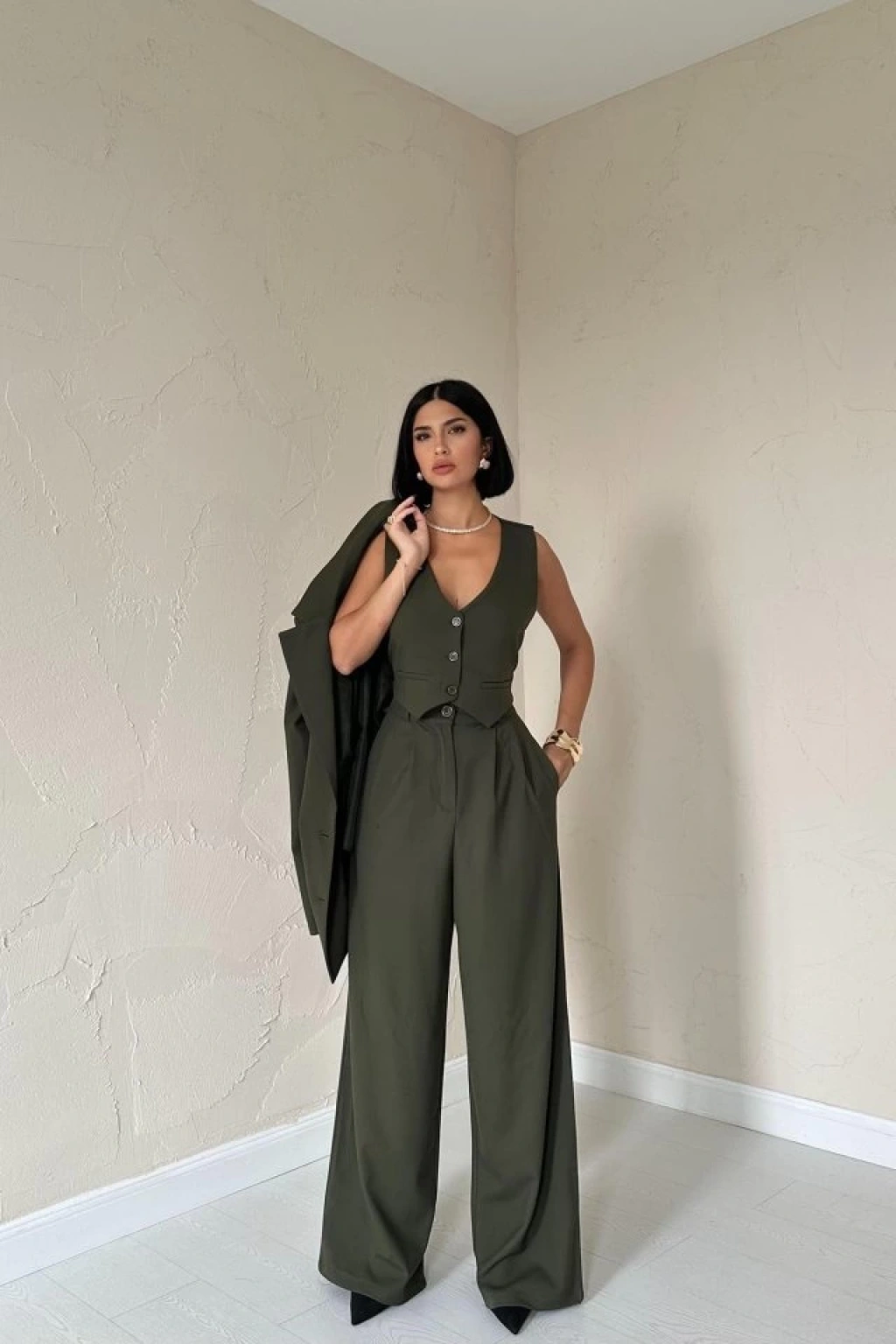 Haki Klas Ceket Ve Yelek Ve Pantolon Takım