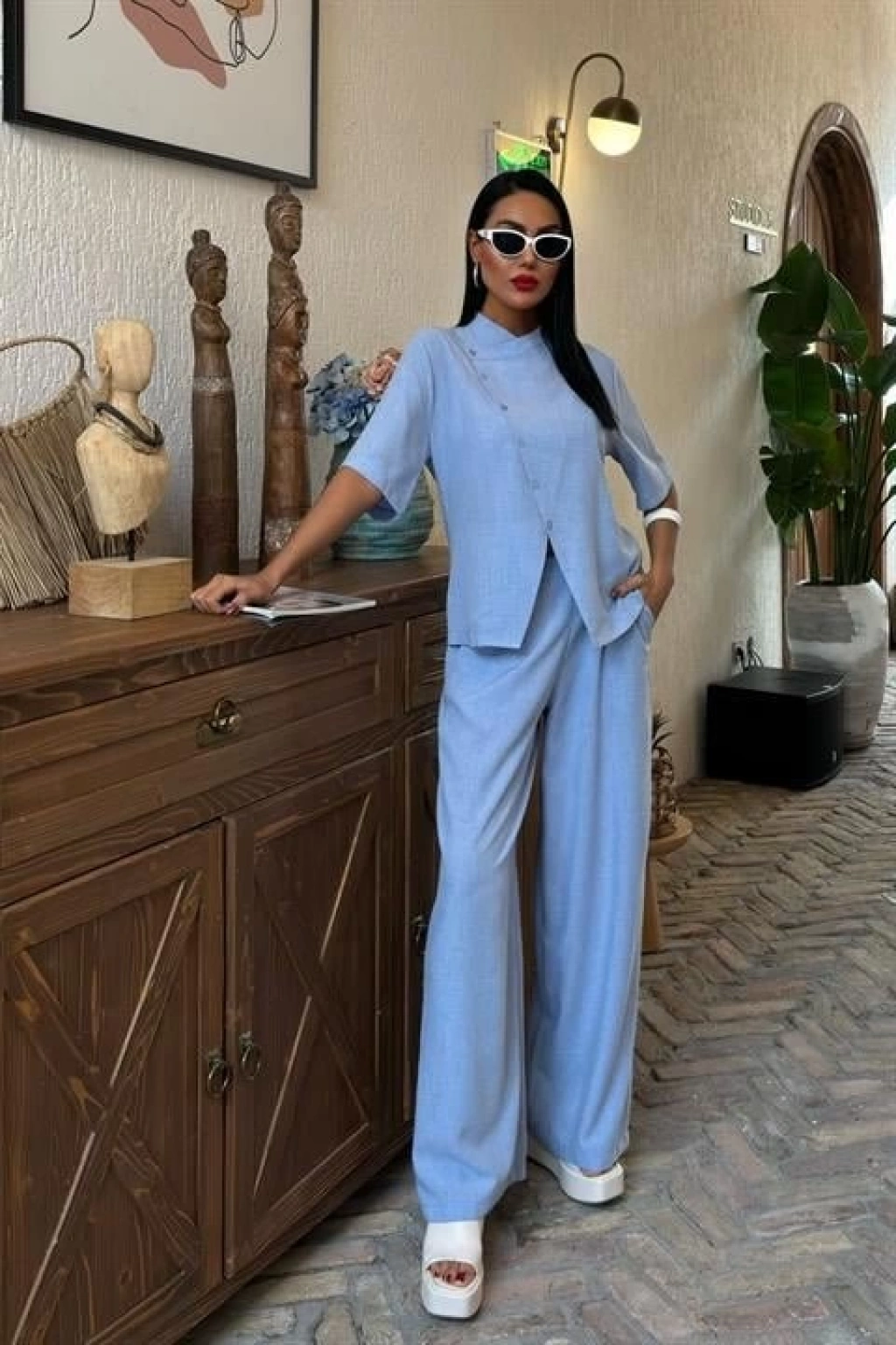 Hakim Yaka Çapraz Düğmeli Plazzo Pantolon Viscon Keten Takım 10091